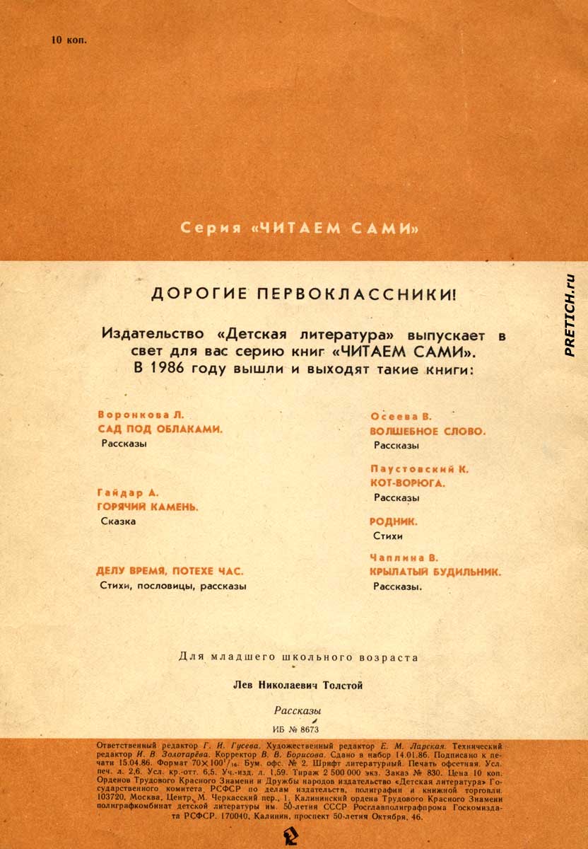 Рассказы Льва Николаевича Толстого издавались много и часто, и потому тут всегда надо уточнять. В данном случае мы имеем детскую книжку в мягкой обложке, издательства "Детская литература", Москва, 1986 год. Серия "Читаем сами"... Иллюстрации художника А. Слепкова.