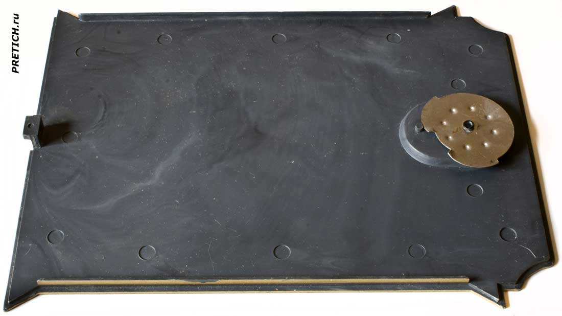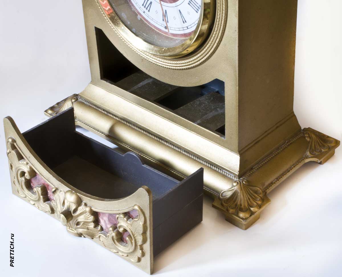Впереди, под циферблатом есть выдвижная емкость - шкатулочка...