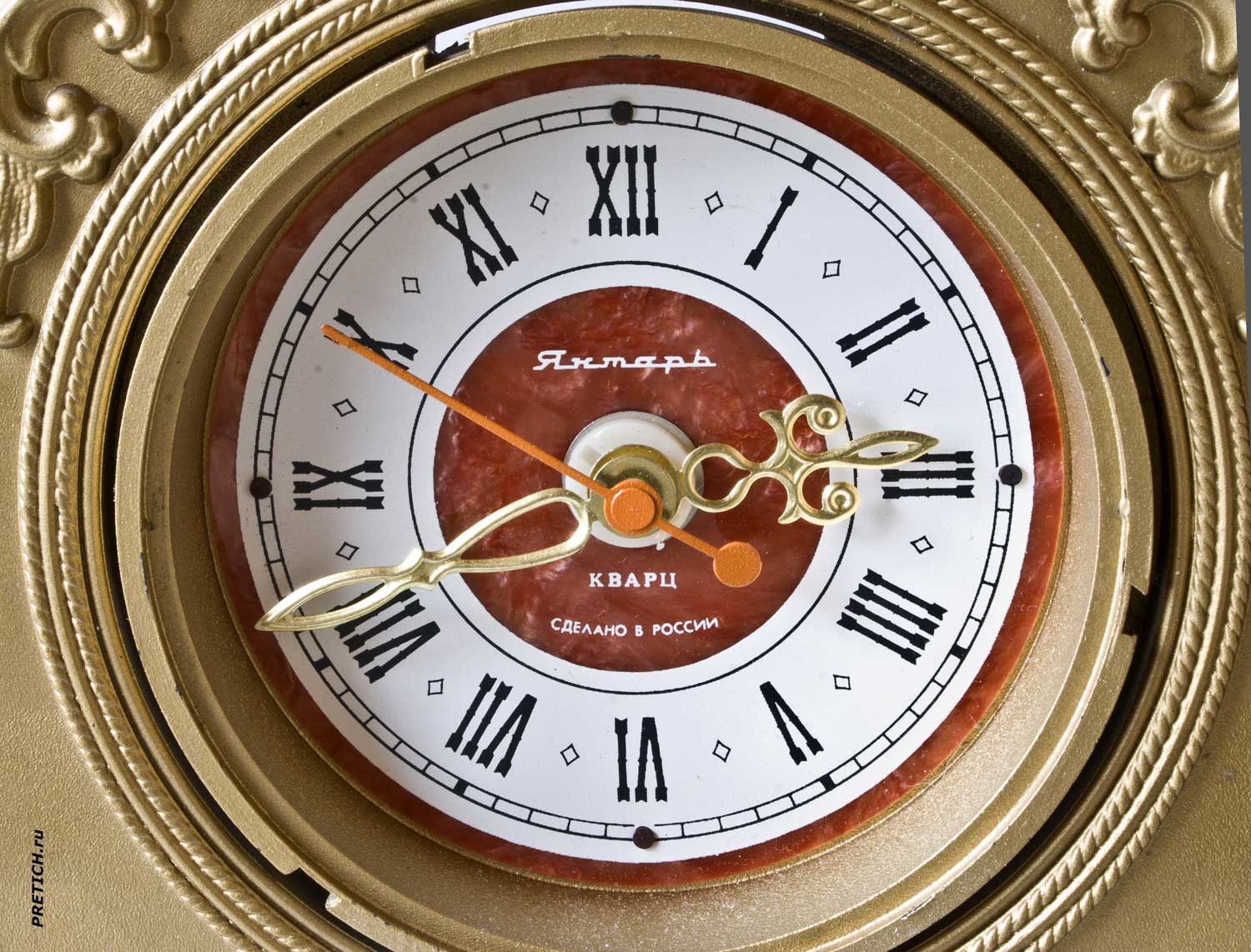 Циферблат - белый пластмассовый диск с нанесенной разметкой и надписями, прибит стальными гвоздиками к пластмассовому корпусу часов... Разметка римскими цифрами. Надпись: Янтарь. Кварц. Сделано в России.
