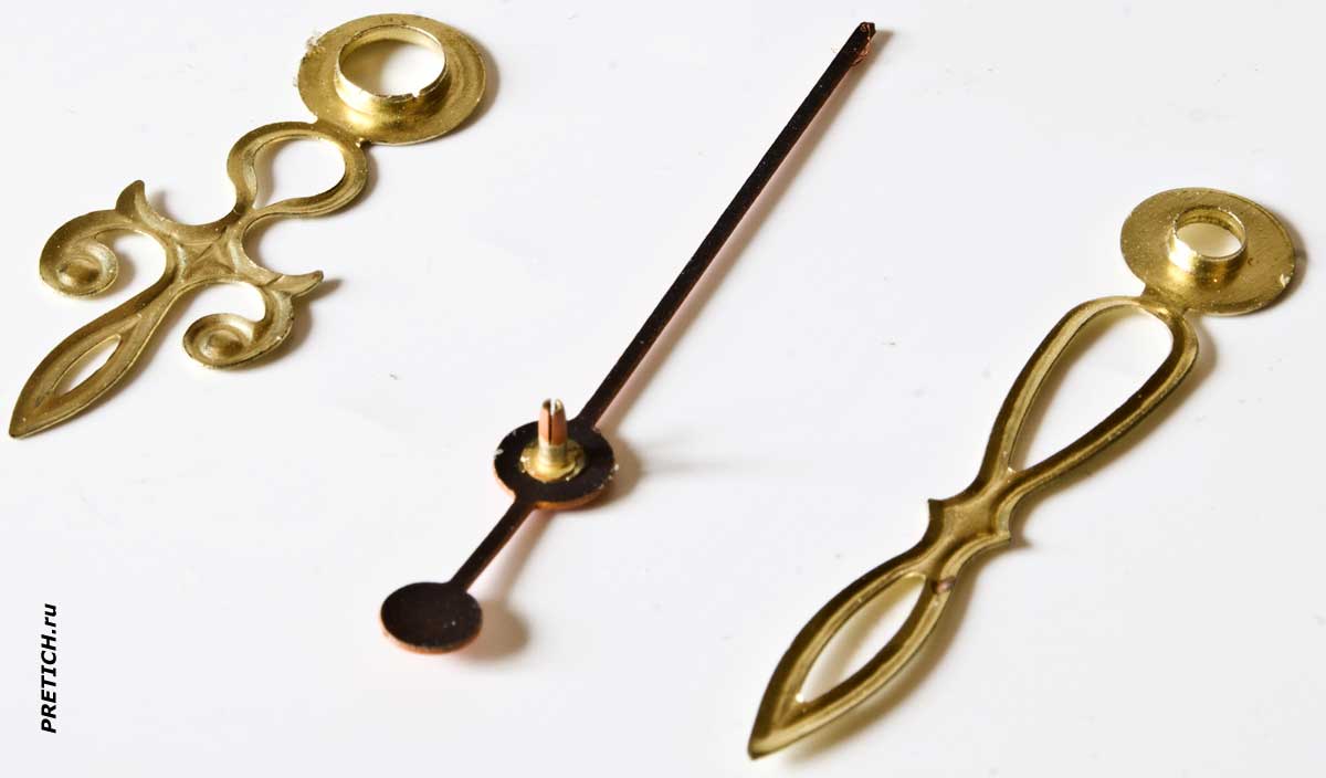Часовая и минутная стрелки сделаны из латуни, секундная стрелка из стали, с впрессованной латунной втулкой.