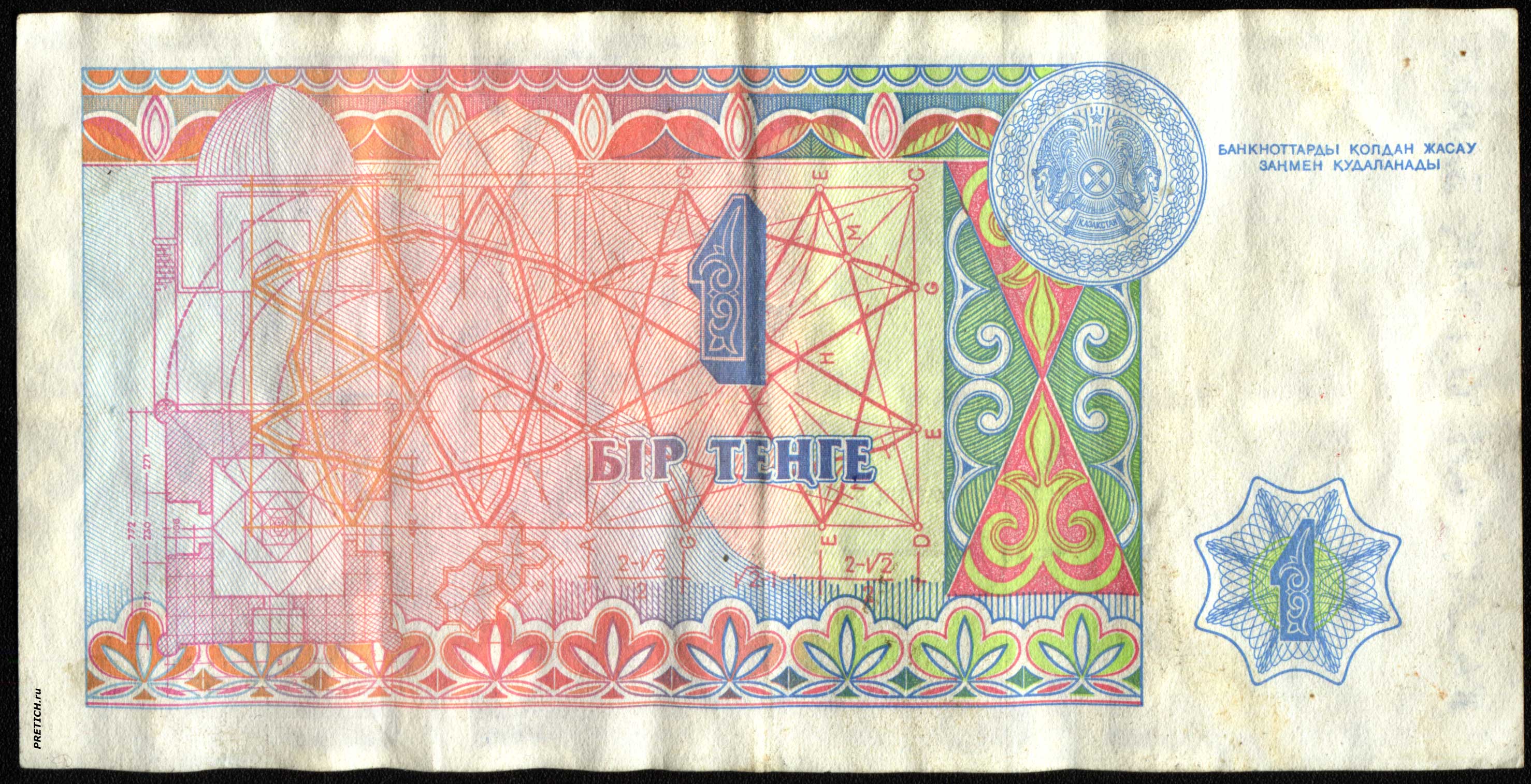 Это обратная сторона банкноты, где опять же условные чертежи, которые не имеют к реальному Аль-Фараби никакого отношения... И герб Казахстана.