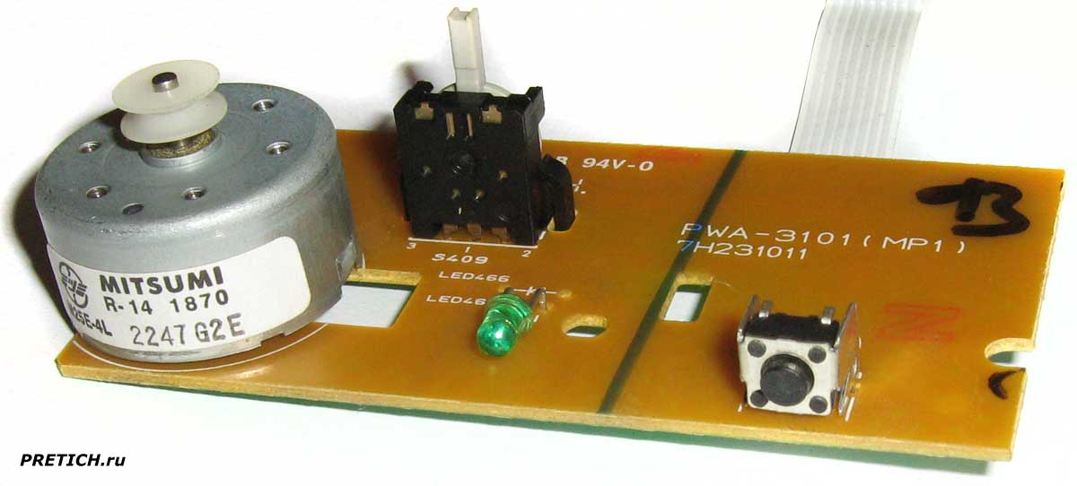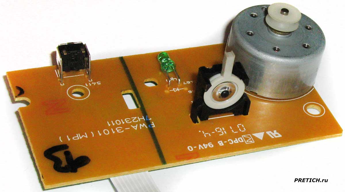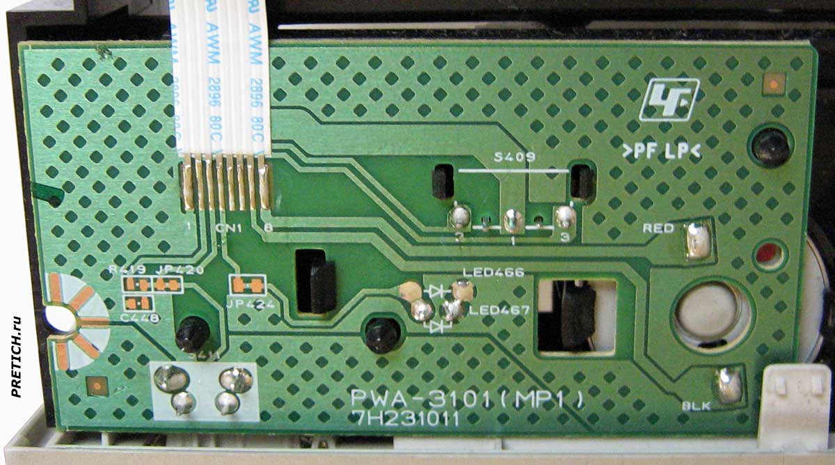 Плата передней панели. Маркировка DPC-B PWA-3101(MP1) 7H231011... Здесь концевой выключатель, кнопка открытия или закрытия лотка, светодиодный индикатор...