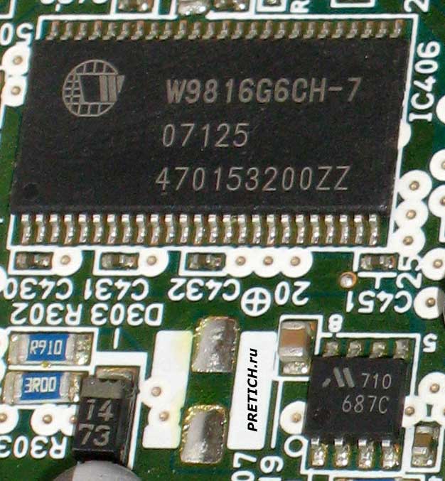 Две микросхемы - одна чип оперативной памяти W9816G6CH-7 с логотипом Winbond. И еще неведомый восьминогий чип 710 687C...