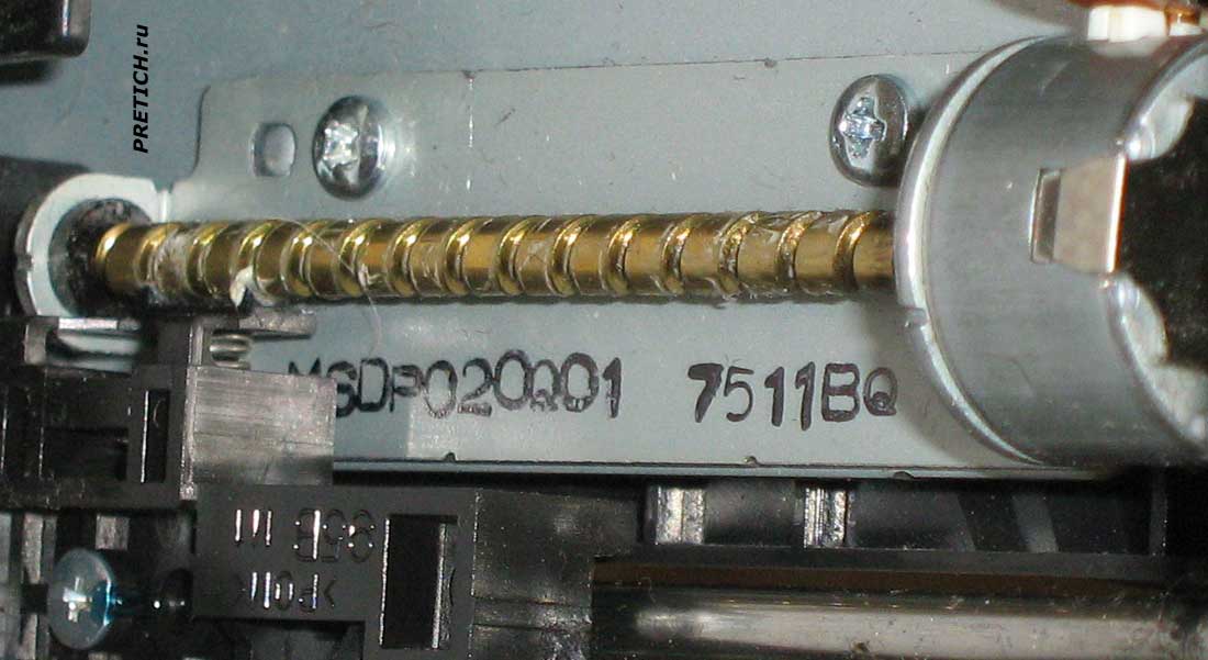 Электродвигатель здесь имеет этикетку Mitsumi M25E-4L R-14 1870 2247G2E. На оси ротора пластмассовый шкив, с его помощью двигатель перемещает лоток.