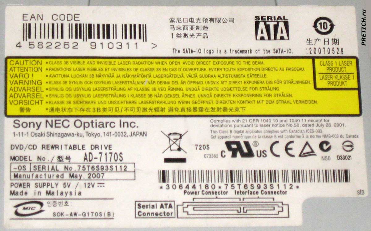 На верхней части корпуса этикетка устройства. На ней всякая информация - полезная и бесполезная. Дата изготовления 2007 05 29... Производитель Sony NEC Optiarc Inc. Название модели AD-7170S. Требования по питанию... Сделано в Малайзии.