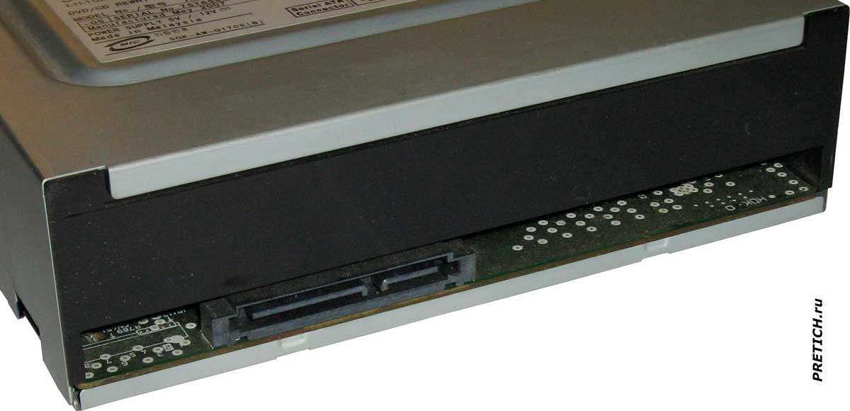 Задняя сторона - здесь большая щель... и два стандартных SATA разъема для питания и передачи данных. Вот эта щель мне категорически не нравится! Явно - это рудимент времен IDE приводов... Но производитель должен ведь понимать, что это - пылесос! Видимо именно из-за этого привод так недолго проработал...