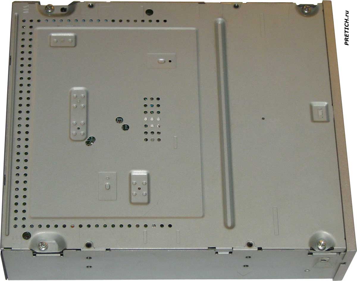 Внутри стандартная картина: основная плата электроники, еще маленькая плата передней панели и двигатель, перемещающий трей с диском, блок лазерной головки, со всеми необходимыми элементами... Все это смонтировано на пластмассовом каркасе - шасси.