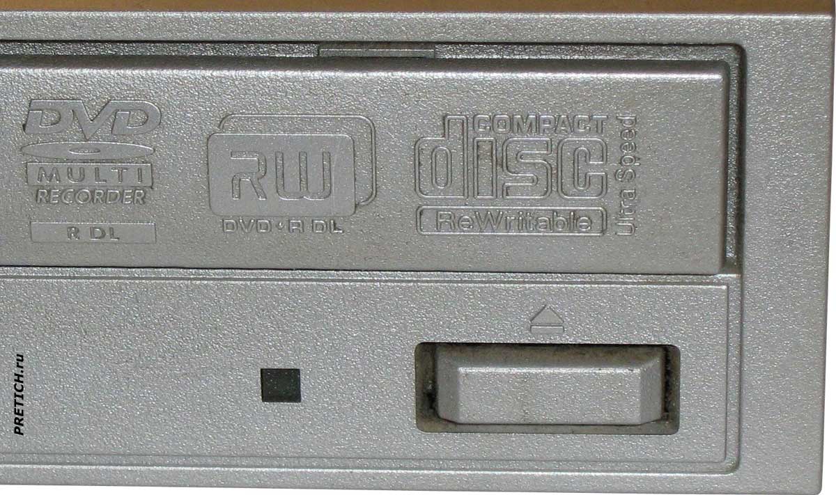 Не ней вот такие надписи и элементы управления... кнопка открытия и закрытия, светодиодный индикатор активности... Еще влево есть отверстие для экстренного извлечения диска - тыкаем туда, например скрепкой и лоток выдвигается.