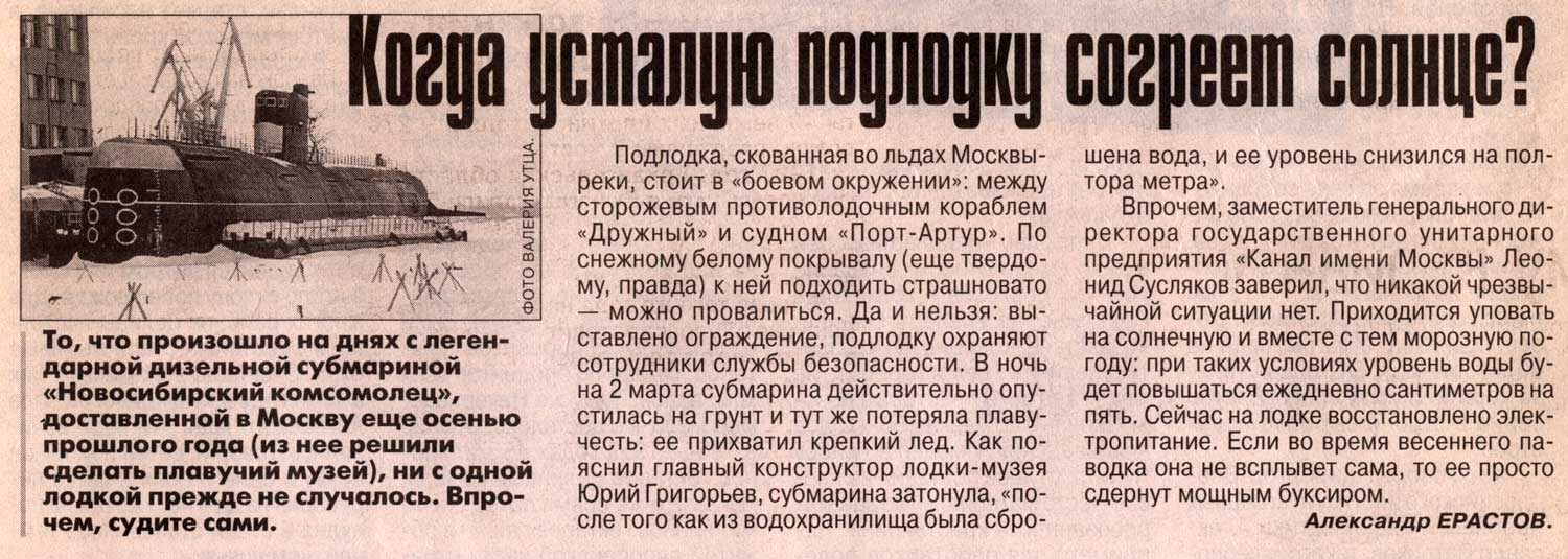 Подлодка, скованная во льдах Москвы-реки, стоит в «боевом окружении»: между сторожевым противолодочным кораблем «Дружный» и судном «Порт-Артур». По снежному белому покрывалу (еще твердому, правда) к ней подходить страшновато — можно провалиться. Да и нельзя: выставлено ограждение, подлодку охраняют сотрудники службы безопасности. В ночь на 2 марта субмарина действительно опустилась на грунт и тут же потеряла плавучесть: ее прихватил крепкий лед. Как пояснил главный конструктор лодки-музея Юрий Григорьев, субмарина затонула, «после того как из водохранилища была сброшена вода, и ее уровень снизился на полтора метра».