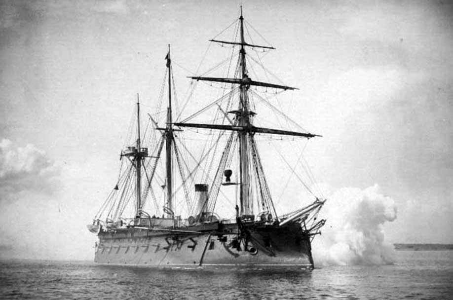 ...«Мерримак», построенный в 1855 году в Чарльстоне, считался одним из лучших паровых фрегатов американского флота. В начале Гражданской войны в США северяне подожгли и потопили его, чтобы корабль не достался южанам. Те подняли «Мерримак», срезали борт выше ватерлинии, уложили поверх палубы перекрещенные железные рельсы, а на них —76 мм броню. На палубе расставили десять пушек калибром от 152 до 229 мм, в носовой части устроили массивный шпирон и дали кораблю новое название «Вирджиния».
