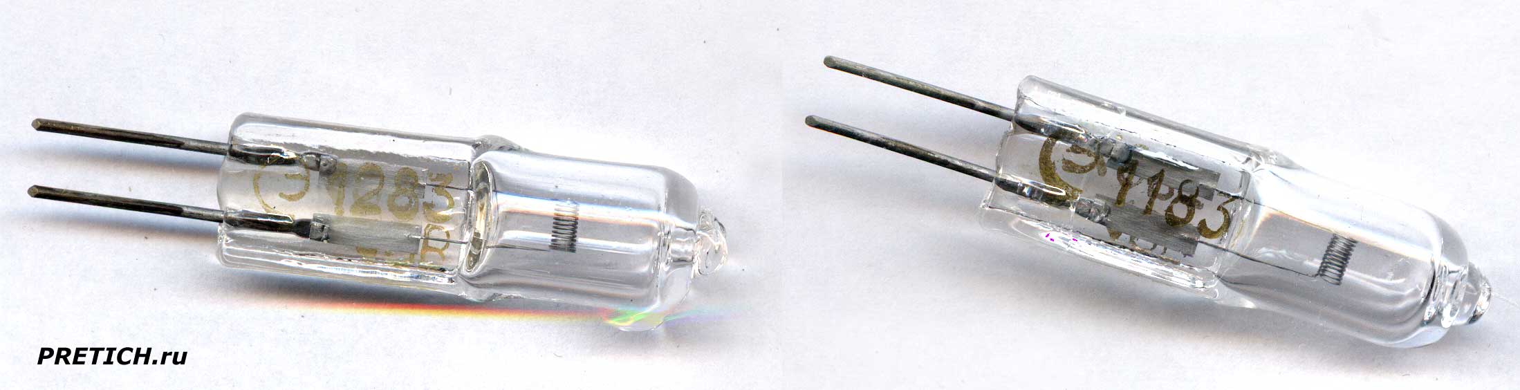 Маленькие стеклянные колбы - кварцевое стекло. Длина 45 мм, диаметр 9,5 мм, масса - не более 3 грамм. Ближе к выводам нанесена маркировка: логотип производителя и дата 1183 и на другой 1283 одна изготовлена в ноябре, другая в декабре 1983 года.