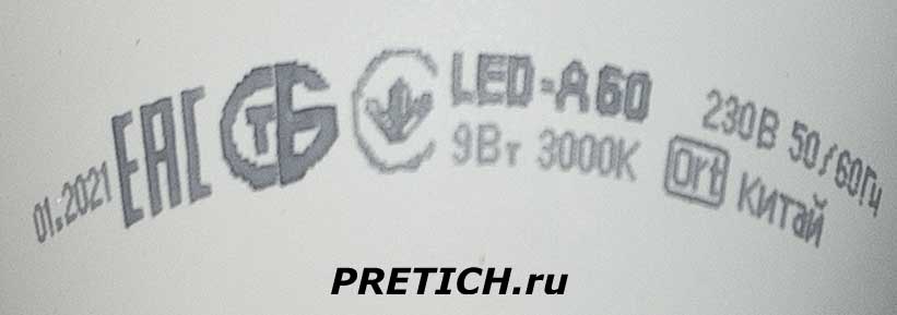 Есть и еще маркировка: 01.2021 - вероятно дата изготовления. ЕАС и другие значки... LED-A60 9Вт 3000К... Китай...