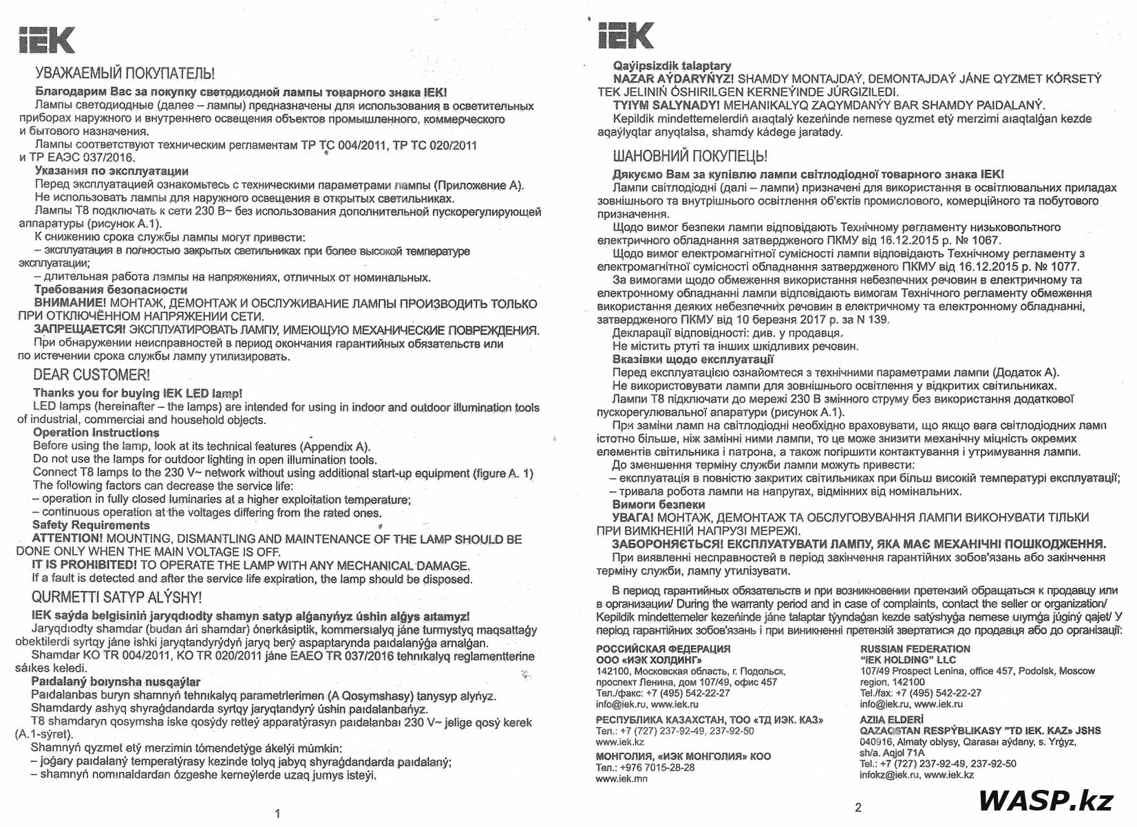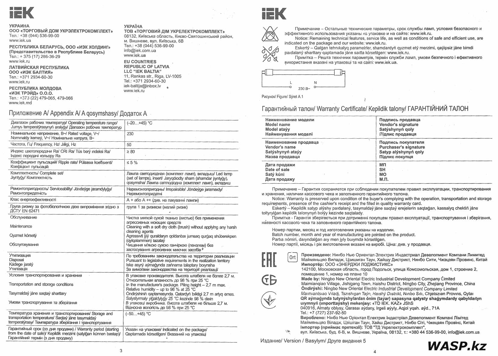 Указана техническая информация, на русском, английском, украинском и казахском языках: