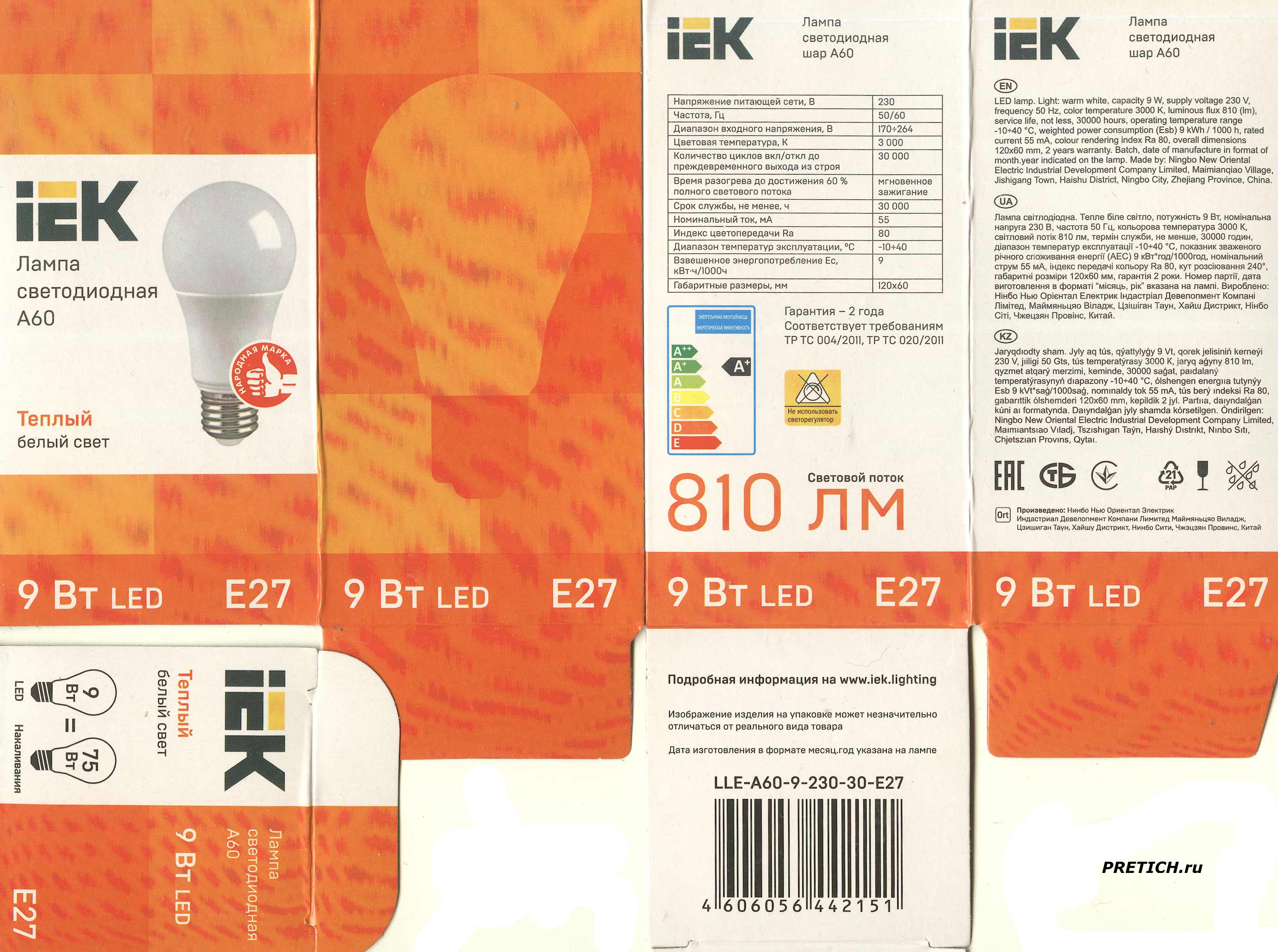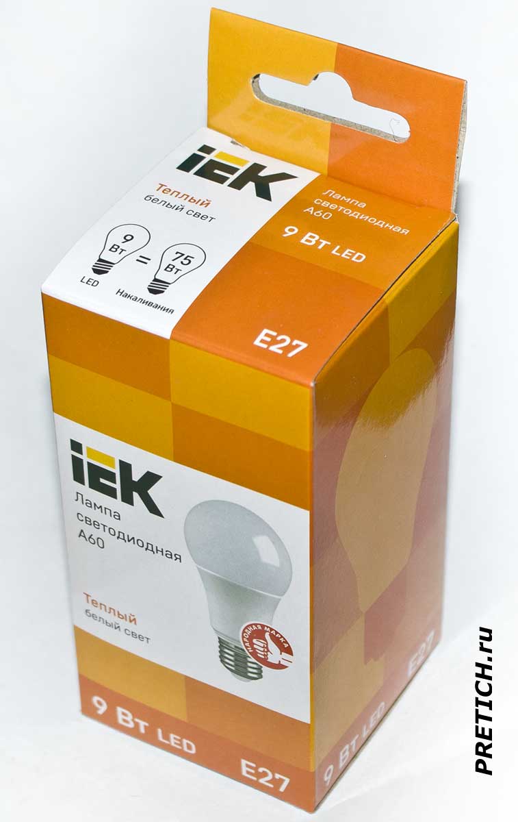На коробке есть такое: Лампа светодиодная А60, Теплый свет. Народная марка. Затем указано, что 9 Вт этой LED лампочки равно 75 Вт обычной лампы накаливания...