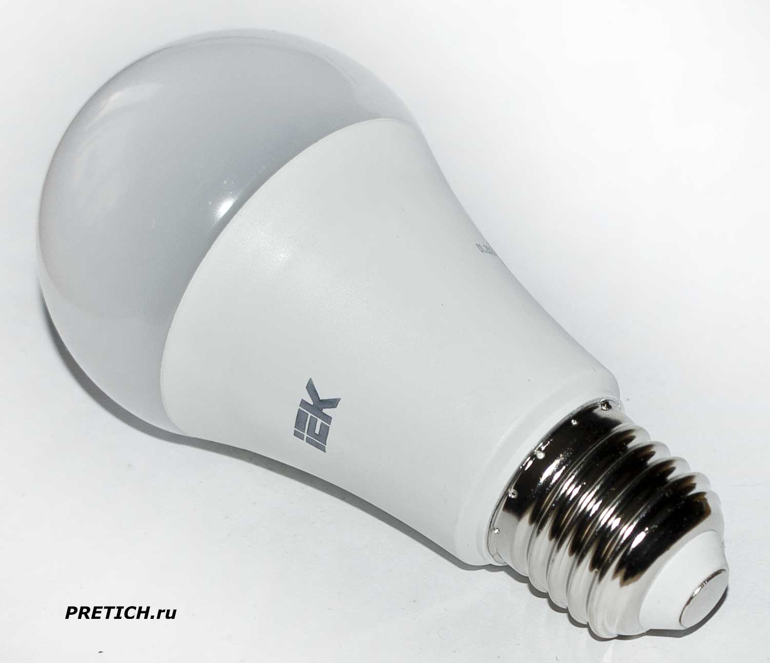 Сама лампа - стандартной грушевидной формы. Молочно белая пластмассовое "горлышко" с логотипом iEK. С одного бока стандартный цоколь. С другого - матовый сферический плафон.