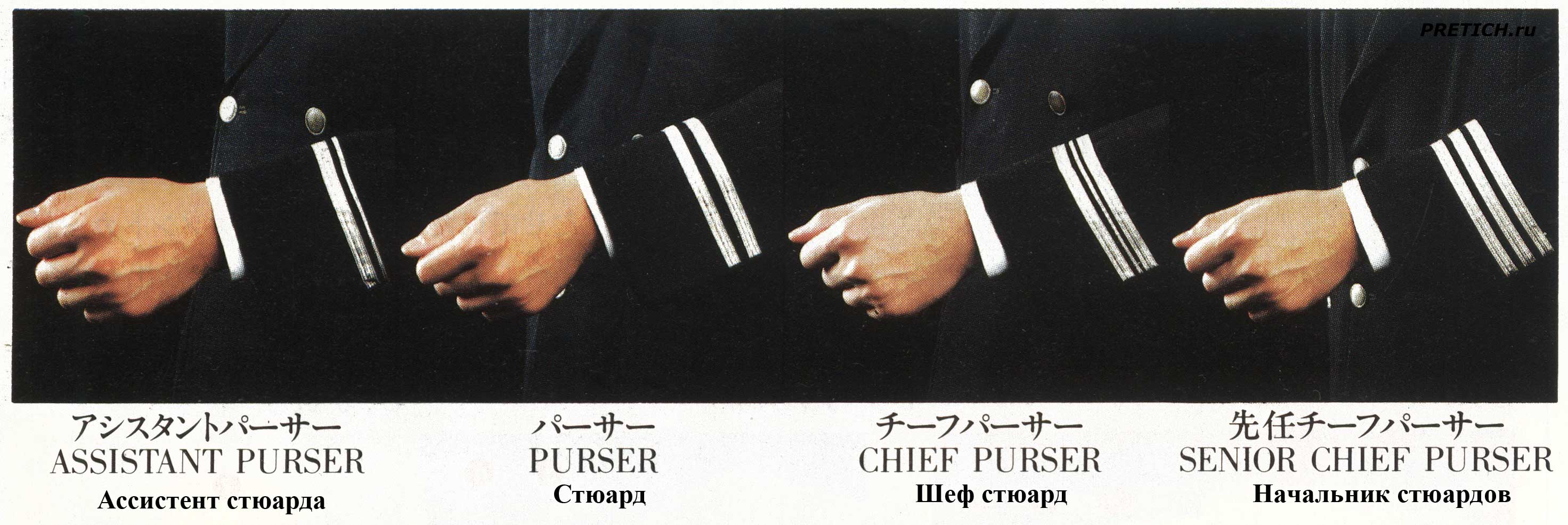 Нашивки на форменном мужском кителе для стюардов JAL - Japan Airlines, обозначающие деление на ранги.