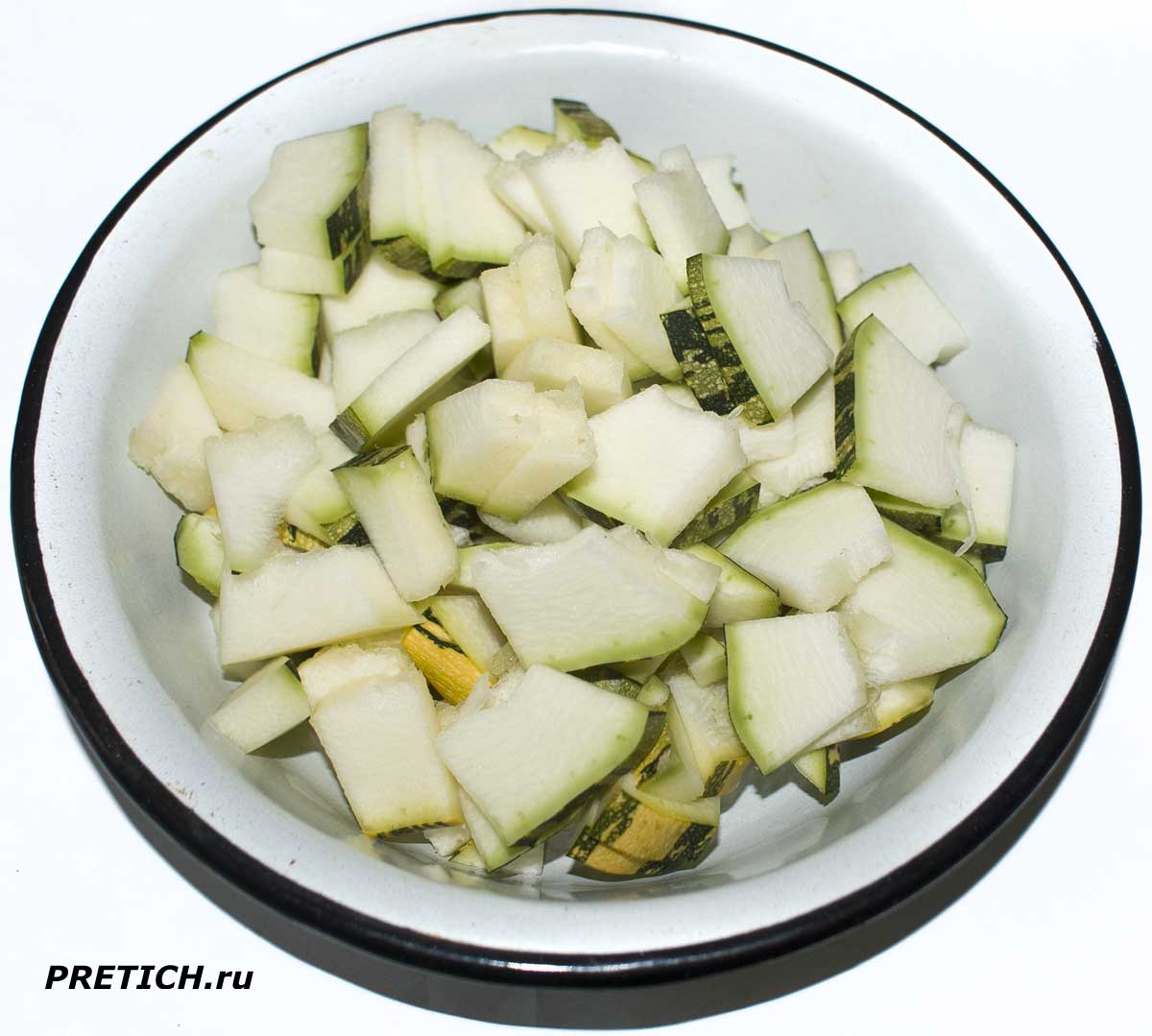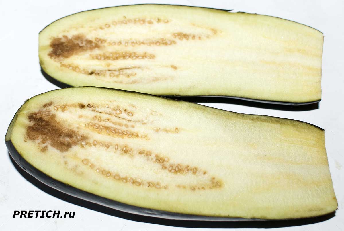 Видите - на разрезе темнеют уже... вырезаем это, остальное крошим и... в казан! Баклажаны готовятся быстрее кабачков, поэтому их закладываем несколько позже.