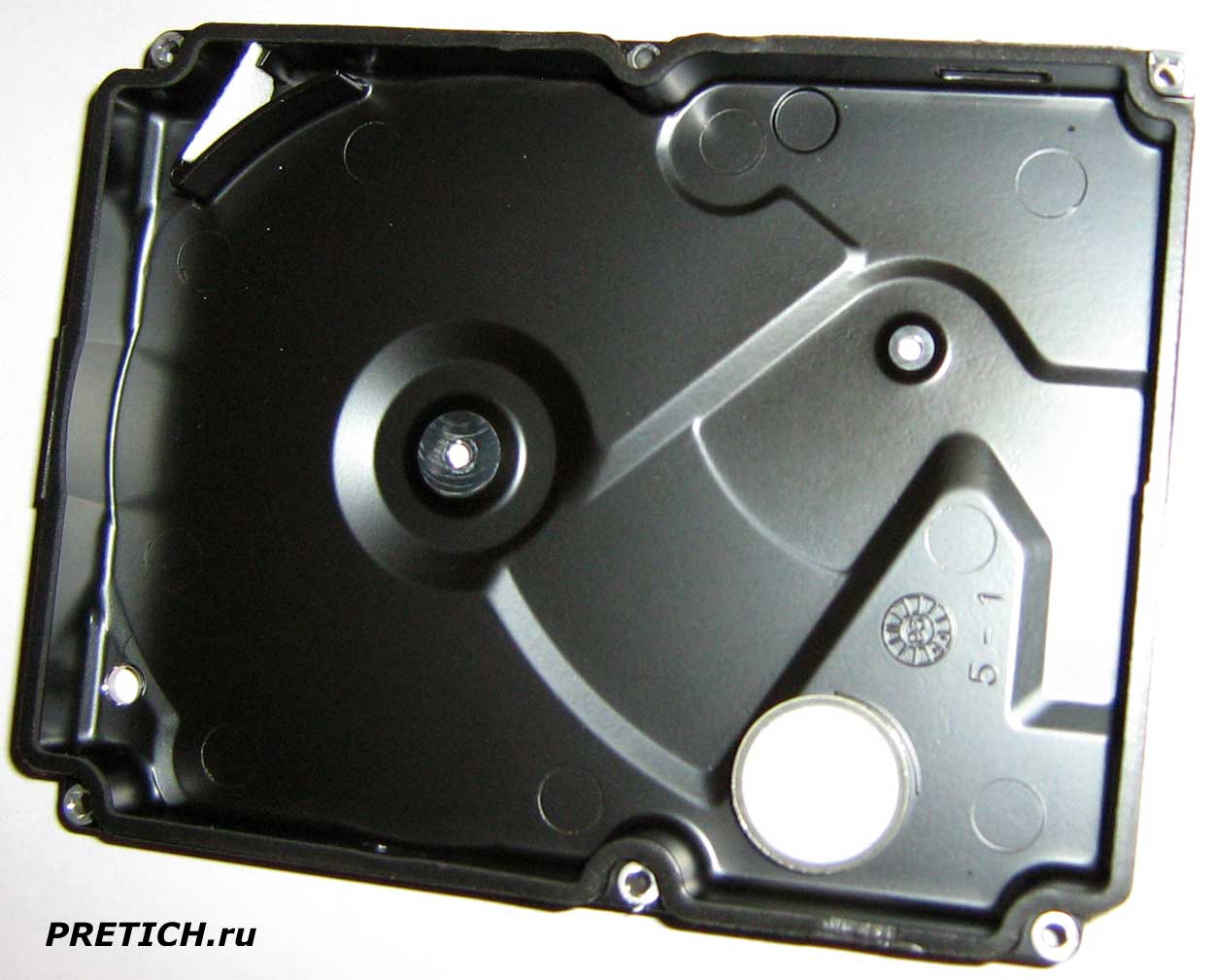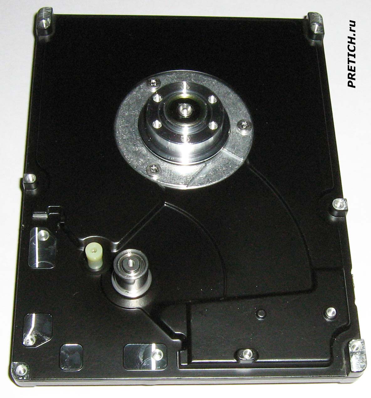 Верхняя крышка гермоблока - она алюминиевая, литая, и такие использовала компания Самсунг, насколько я знаю. И это было очень давно... На крышке мы видим два отверстия под винты - на ось шпиндельного двигателя и на ось серводвигателя. Далее - кармашек со вставкой пылеулавливателя. Пластиковый цилиндр, приклеенный к корпусу, с той стороны должно быть маленькое отверстие - это устройство для выравнивания давления с фильтрами. Если кто думает, что внутри жесткого диска вакуум - тот глубоко ошибается.