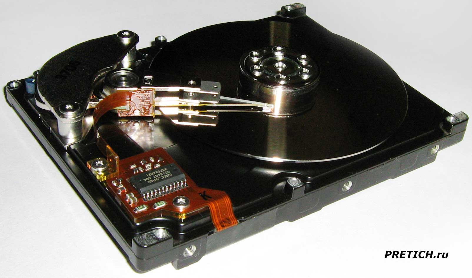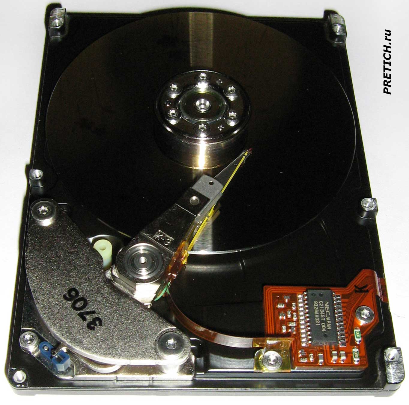 Вот HDD внутри, без крышки... Видим, что здесь использована всего одна пластина, но на блоке магнитных головок есть одно пустующее плечо - без головки... вероятно, эта модель урезанная и на ее основе выпускались диски и большей емкости.
