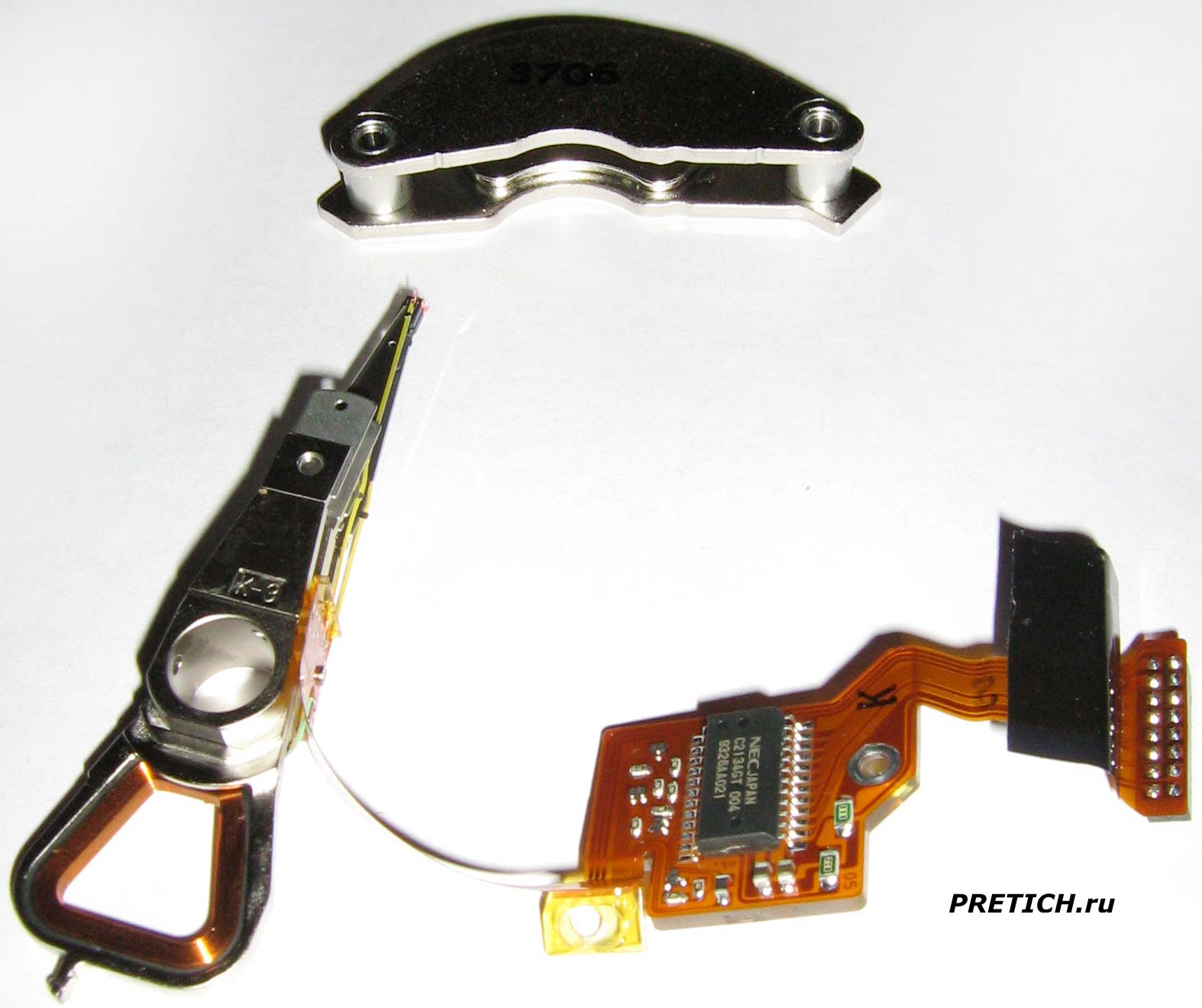 А это БМГ - блок магнитных головок. Мощные неодимовые магниты, между которыми движется катушка - соленоидный двигатель, который через рычаг двигает головки. Они через гибкий шлейф соединены с платой, на которой микросхема NEC C2134GT 004 - это обработчик и усилитель сигналов. Далее снова гибкий шлейф, на конце которого разъем - он уже на внешней стороне гермоблока.