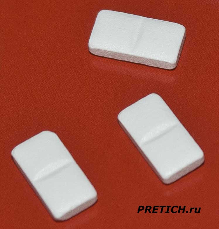 Сами таблетки прямоугольные, белого цвета, с четкой разделительной полосой посередине.