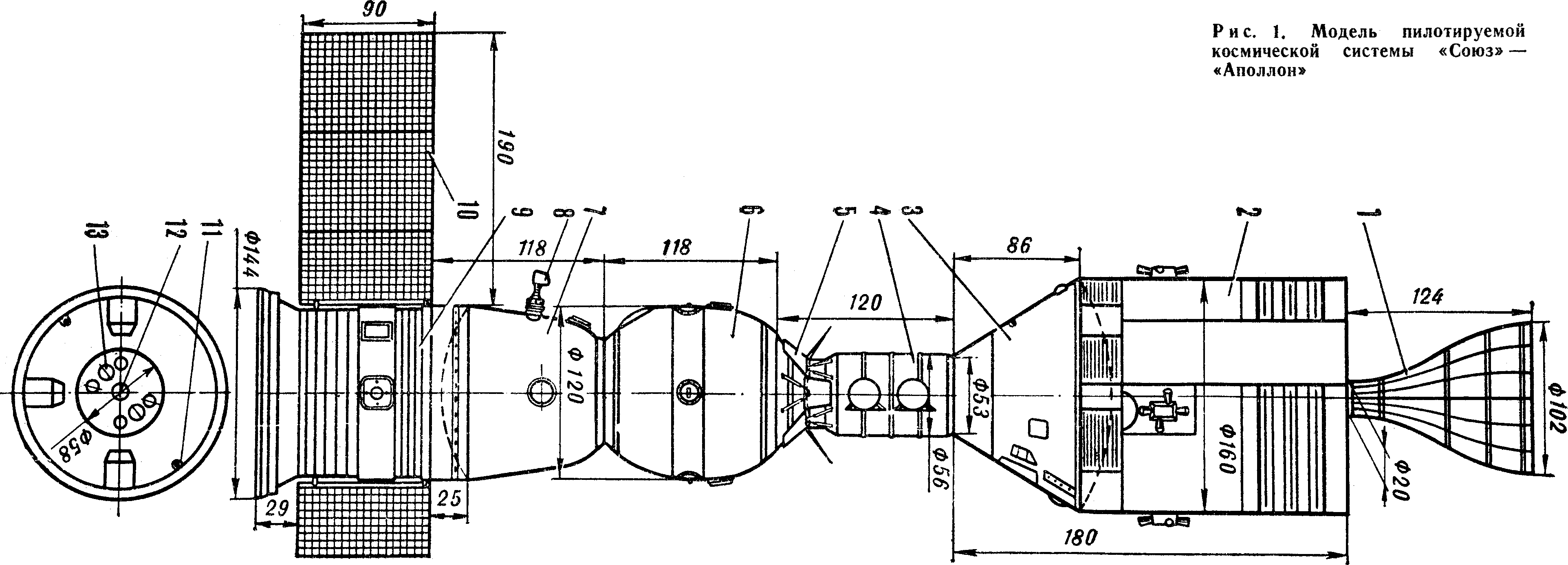 Рис. 1. Модель пилотируемой космической системы «Союз» — «Аполлон»: 1 — сопло, 2 — агрегатный отсек «Аполлона», 3 — спускаемый аппарат, 4 — шлюзовая камера, 5 — андрогинный стыковочный узел, 6 — орбитальный отсек «Союза», 7 — спускаемый аппарат, 8 — оптический визир-ориентатор, 9 — приборно-агрегатный отсек, 10 — панели солнечной батареи, 11 — датчик на торможение, 12 — сближающе-корректирующий (основной) двигатель, 13 — дублирующий корректирующий двигатель, 14 — рулевые сопла.