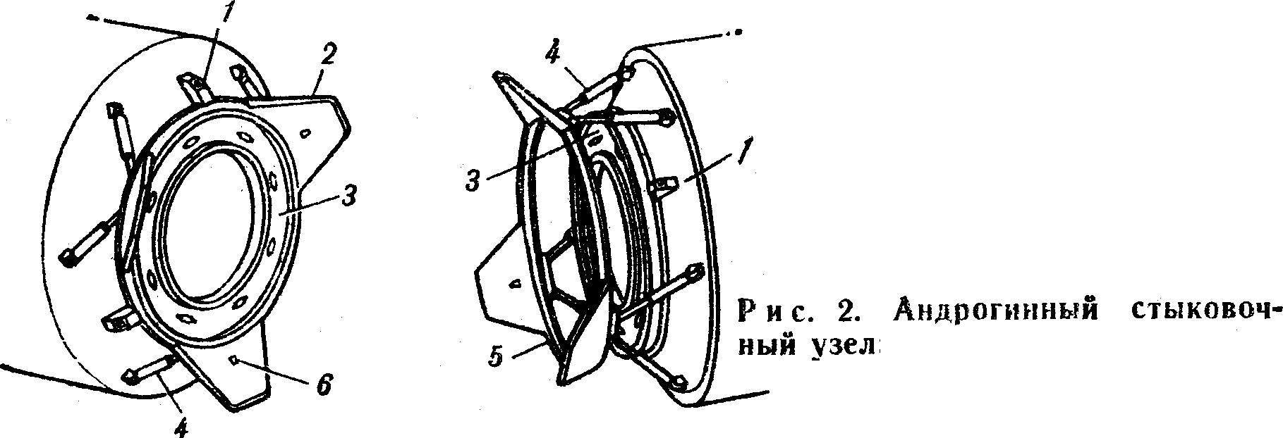Что же представляют собой участвующие в эксперименте космические корабли и стыковочный агрегат? До сих пор в СССР и США использовались разные системы сближения и стыковки космических кораблей. Это была первая проблема, которую предстояло решить ученым. Остановились на принципе периферийной конструкции стыковочного устройства андрогинного типа. Такая конструкция отличается от предыдущих тем, что вместо центрального штыря (у активного стыковочного устройства) и приемного конуса (у пассивного) каждый корабль будет иметь расположенные по периферии стыковочного узла направляющие лепестки, стягивающие устройства и замки; в центральной части люки, через которые будет осуществляться переход космонавтов.