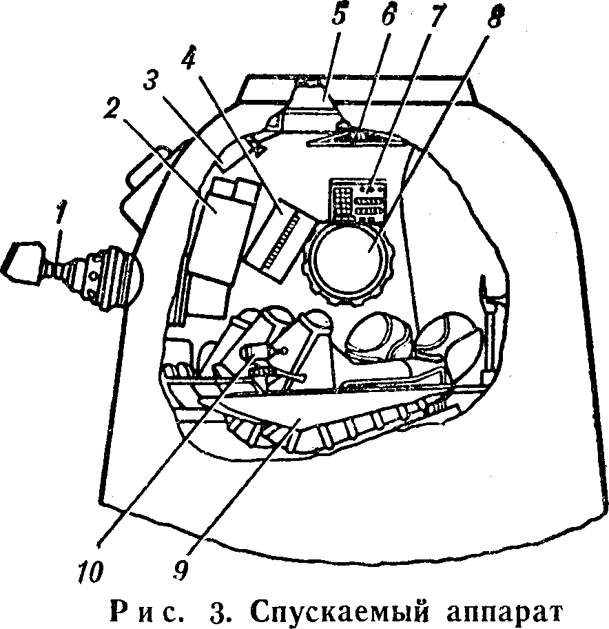 Рис. 3. Спускаемый аппарат: 1 — визир-ориентатор, 2 — приборная доска, 3 — телекамера, 4 — командно-сигнальное устройство (КСУ), 5 — люк-лаз, 6 — штурвал люка-лаза, 7 — пульт, 8 — иллюминатор, 9 — кресло, 10 — ручка управления.