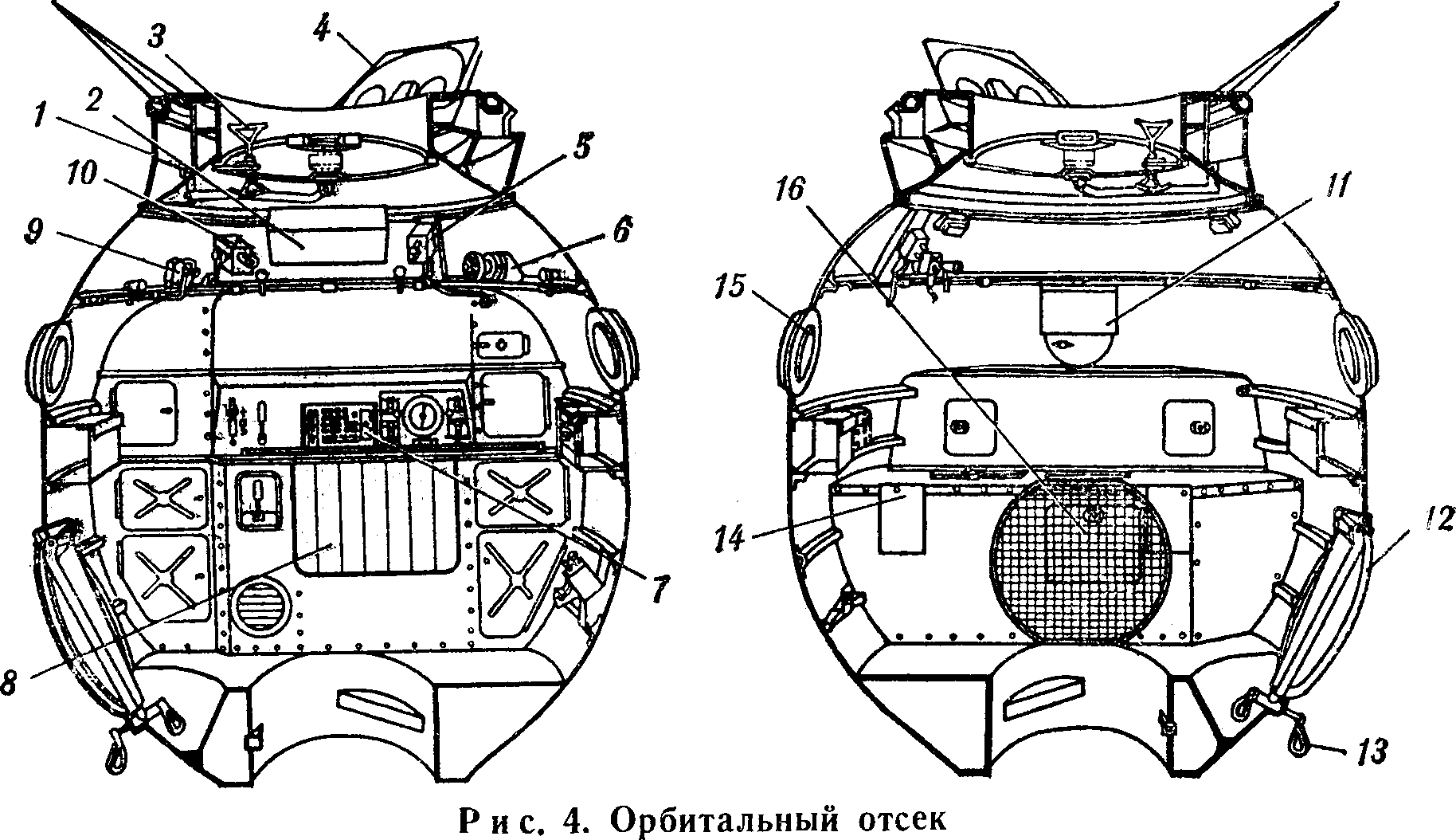 Рис. 4. Орбитальный отсек: левый борт: 1 — стыковочный агрегат, 2 — блок управления системой стыковки, 3 — рукоятка, 4 — направляющий выступ, 5, 10 — телекамеры, 6 — вентилятор, 7 — пульт орбитального отсека, 8 — стол, 9 — кинокамера; правый борт: 11 — газоанализатор, 12 — крышка люка, 13 — рукоятка, 14 — сиденье, 15 — иллюминатор, 16 — скафандры.