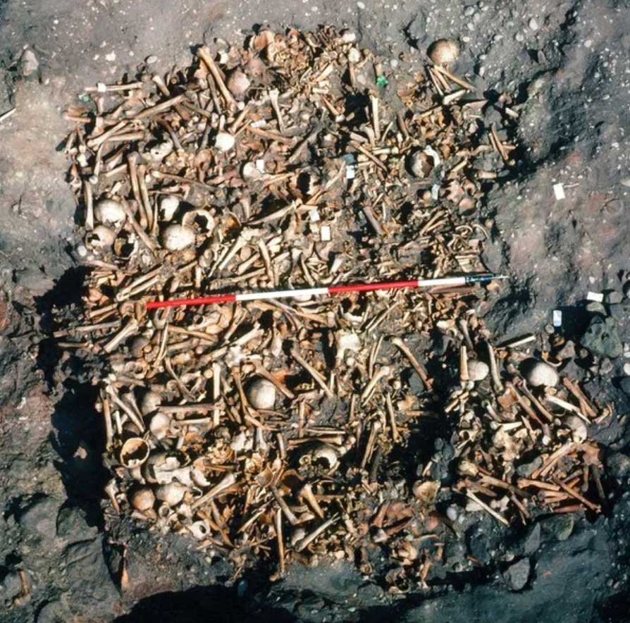 Перемешанные останки более 200 человек, считавшихся погибшими на войне Великой Армии, в саду дома священника Рептона в 1980-х годах