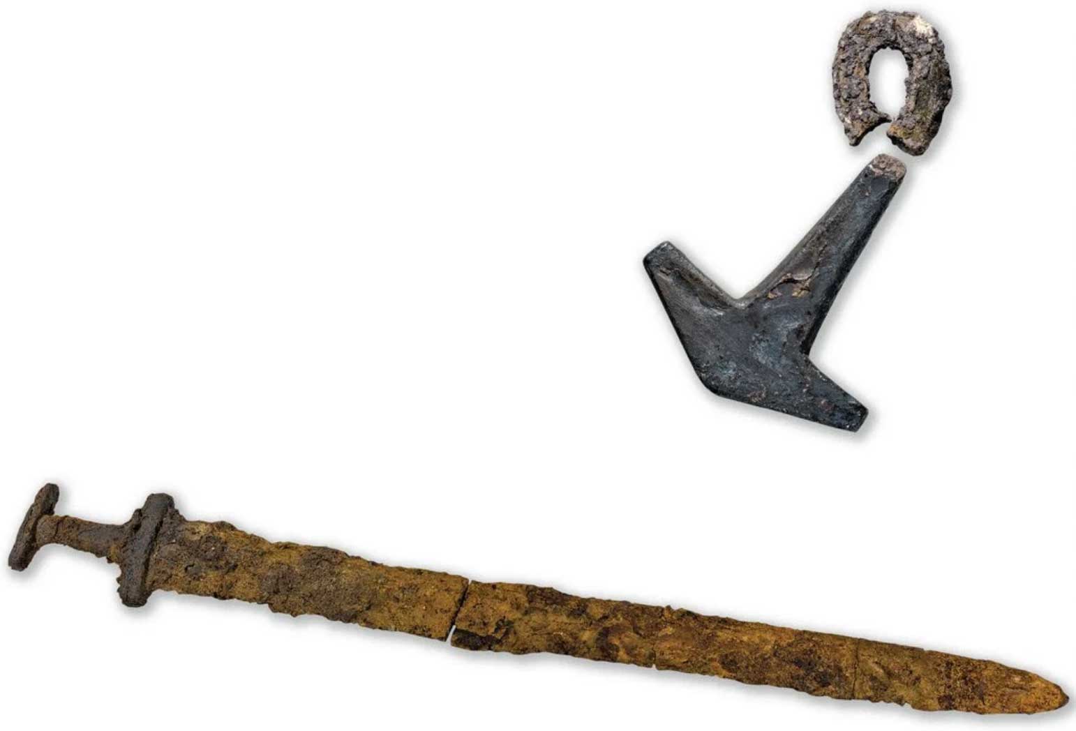 Аверр, серебряный кулон-молот из могилы 511 в Рептоне. Считается, что последователи бога Тора носили маленькие молоты, которые представляли Мьёльнир, волшебный боевой молот Тора, для защиты. Ниже железный меч, найденный рядом с левой ногой скелета в могиле 511 в Рептоне. Меч был вложен в деревянные ножны, обшитые флисом и обтянутые кожей. Музей Дерби