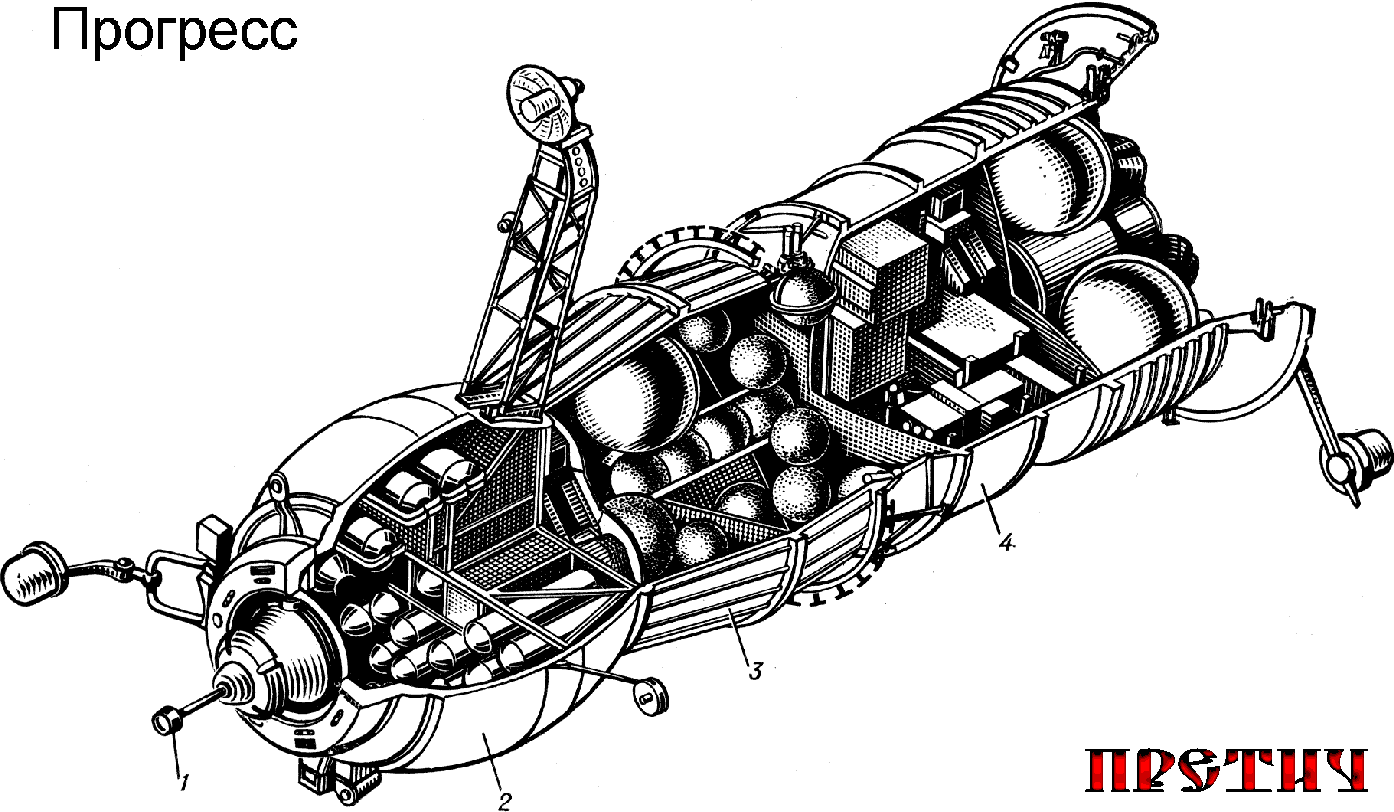 Грузовой корабль «Прогресс»: 1 — стыковочный агрегат; 2 — грузовой отсек (ГО); 3 — отсек компонентов дозаправки (ОКД); 4 — приборо-агрегатный отсек (ПАО)