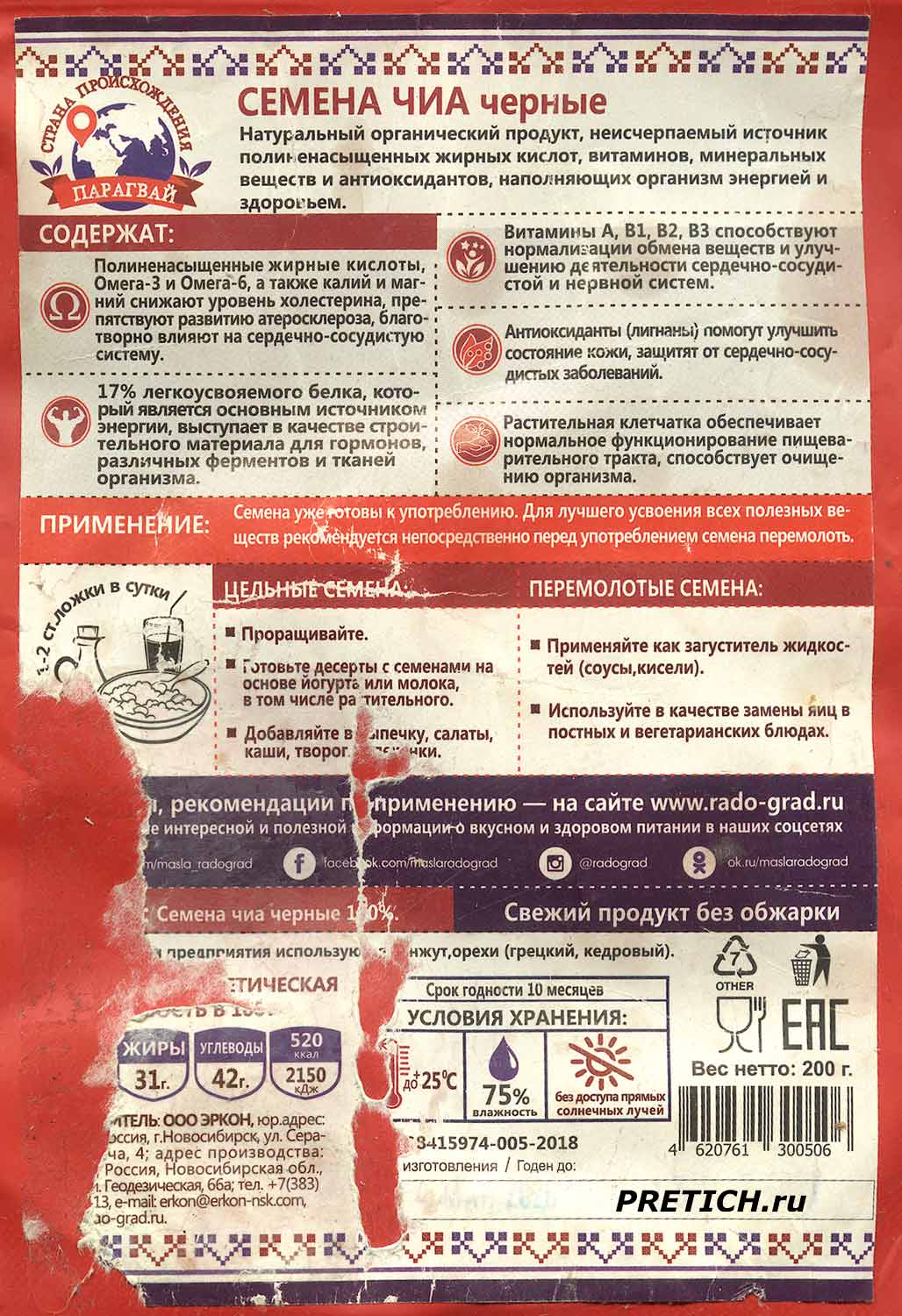 Итак, эти семена содержат полиненасыщенные жирных кислоты Омега -3 и Омега-6, а также калий и магний снижают уровень холестерина... вот как содержание плавно перетекает словно в рекламу... Не бужу повторять - сами читайте, что тут да как. Применение: семена уже готовы к употреблению. Для лучшего усвоения рекомендуется непосредственно перед употреблением перемолоть. 1-2 столовые ложки в сутки... Прочая инфа... Производитель: ООО ЭРКОН - Россия, город Новосибирск... Адрес производства... тут все оборвано - жидкая бумажная наклейка! Впрочем - если сырье из Латинской Америки - какое нафиг производство? Расфасовка и упаковка!