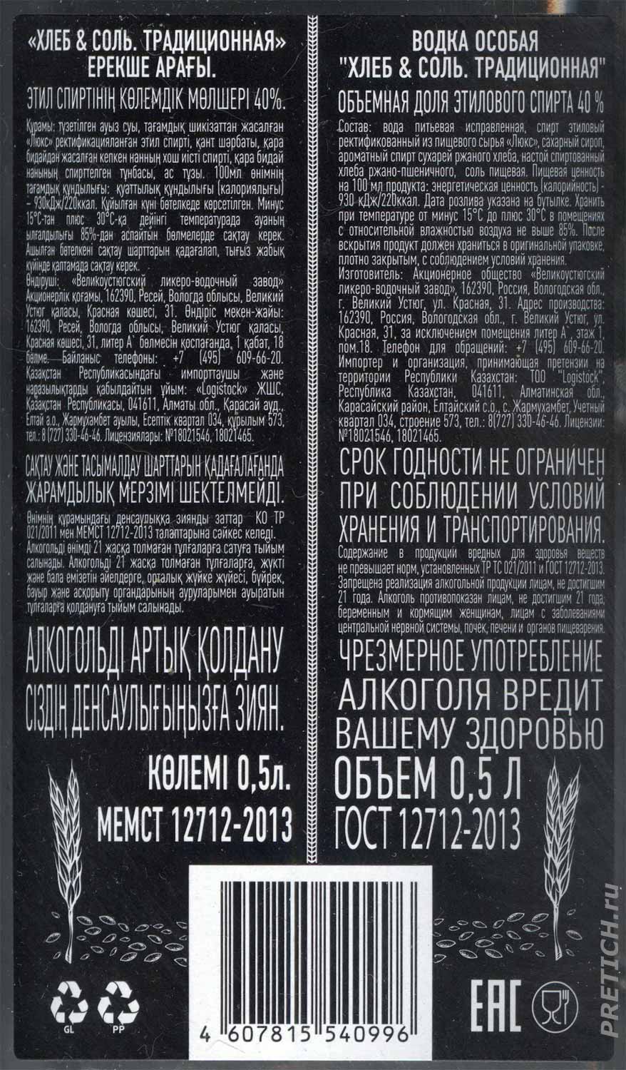 Этикетка с обратной стороны дает больше информации на русском и казахском языках. Состав: вода питьевая исправленная, спирт этиловый ректификованный из пищевого сырья "Люкс", сахарный сироп, ароматный спирт сухарей ржаного хлеба, настой спиртованный хлеба ржано-пшеничного, соль пищевая. ГОСТ 12712-2013, объем 0,5 литра, объемная доля этилового спирта 40%. Изготовитель: АО "Великоустюгский ликеро-водочный завод", Россия, Вологодская область, город Великий Устюг, ул. Красная, 31. Там же располагается и производство (за исключением помещения литер "А", этаж 1, помещение 18). В Казахстан импортирует этот алкоголь ТОО " Logistock", Алматинская область, село Жармухамбет... странное расположение импортера с таким звучным именем!