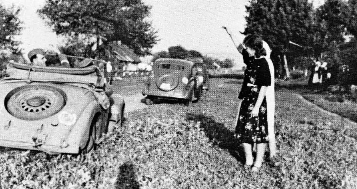 Вдали от Восточного фронта, очередь из трех гражданских автомобилей отряда военных корреспондентов «Лейбштандарта» стоит на обочине дороги, пока пассажиры любуются пейзажами солнечной Франции. Венок из листьев вокруг щита и ключевых дивизионных знаков - в честь вручения дубовых листьев к Рыцарскому кресту «Зеппу» Дитриху. Этот стиль маркировки подразделения использовался на автомобилях LAH во время его пребывания во Франции летом 1942 года. На каждой машине также имеется знак KB [Kriegsberichter] военного корреспондента. [Бундес-архив]