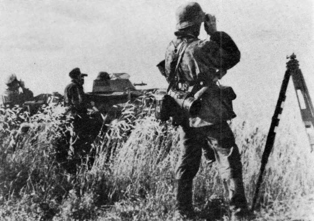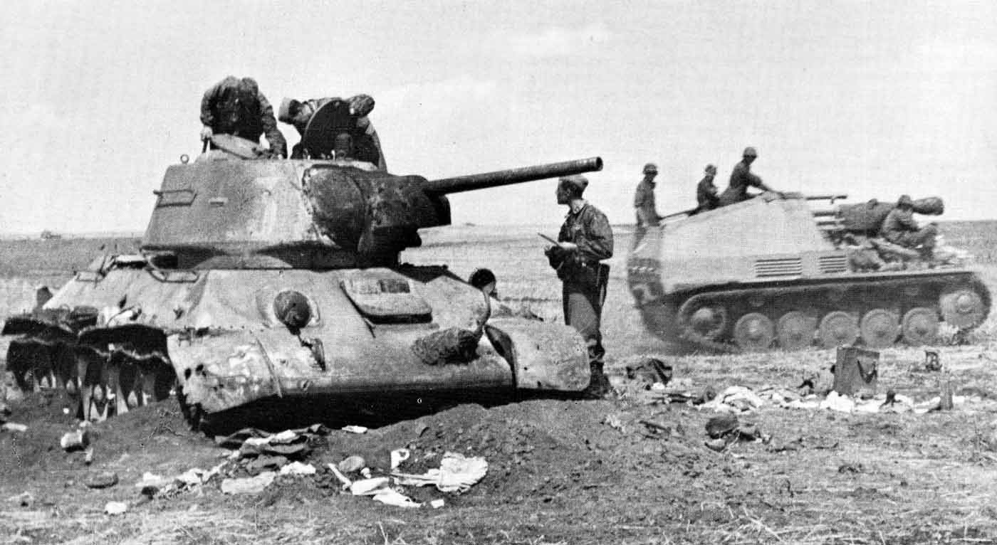 На снимке трое гренадеров-викингов осматривают подбитый советский танк Т-34С. На заднем плане движется Wespe [официально 1FH 18/2 auf Fgst PzKpfw II [Sf] SdKfz 124], самоходная 10,5-см гаубица на шасси PzKpfw II. Совершенно лишенный опознавательных знаков, Wespe полностью окрашен в Desert Brown, желто-коричневый цвет, адаптированный для DAK в Тунисе, но также используемый на транспортных средствах на Кавказе.