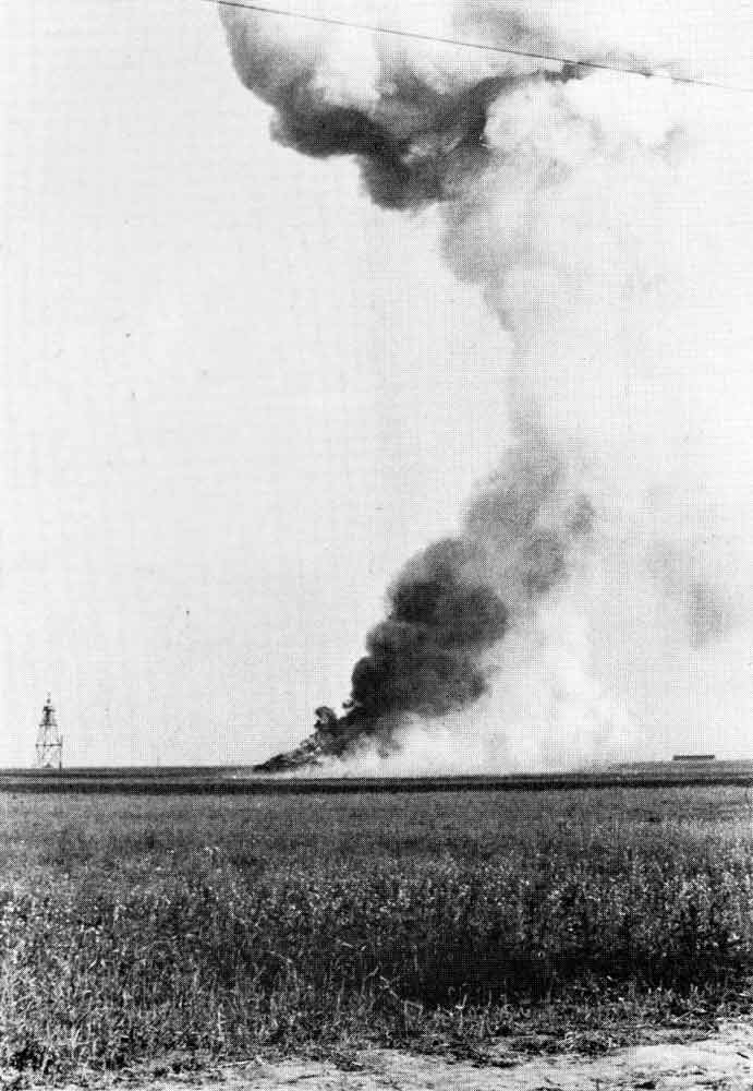 Зрелище, слишком часто встречающееся при движении к кавказским месторождениям нефти. Как и здесь, в Майкопе, который Викинг взял 1 августа 1942 года, отступающие русские обстреливали поля, разрушая насосы, устья скважин и башни, делая нефть бесполезной для врага. [Бундесархив]