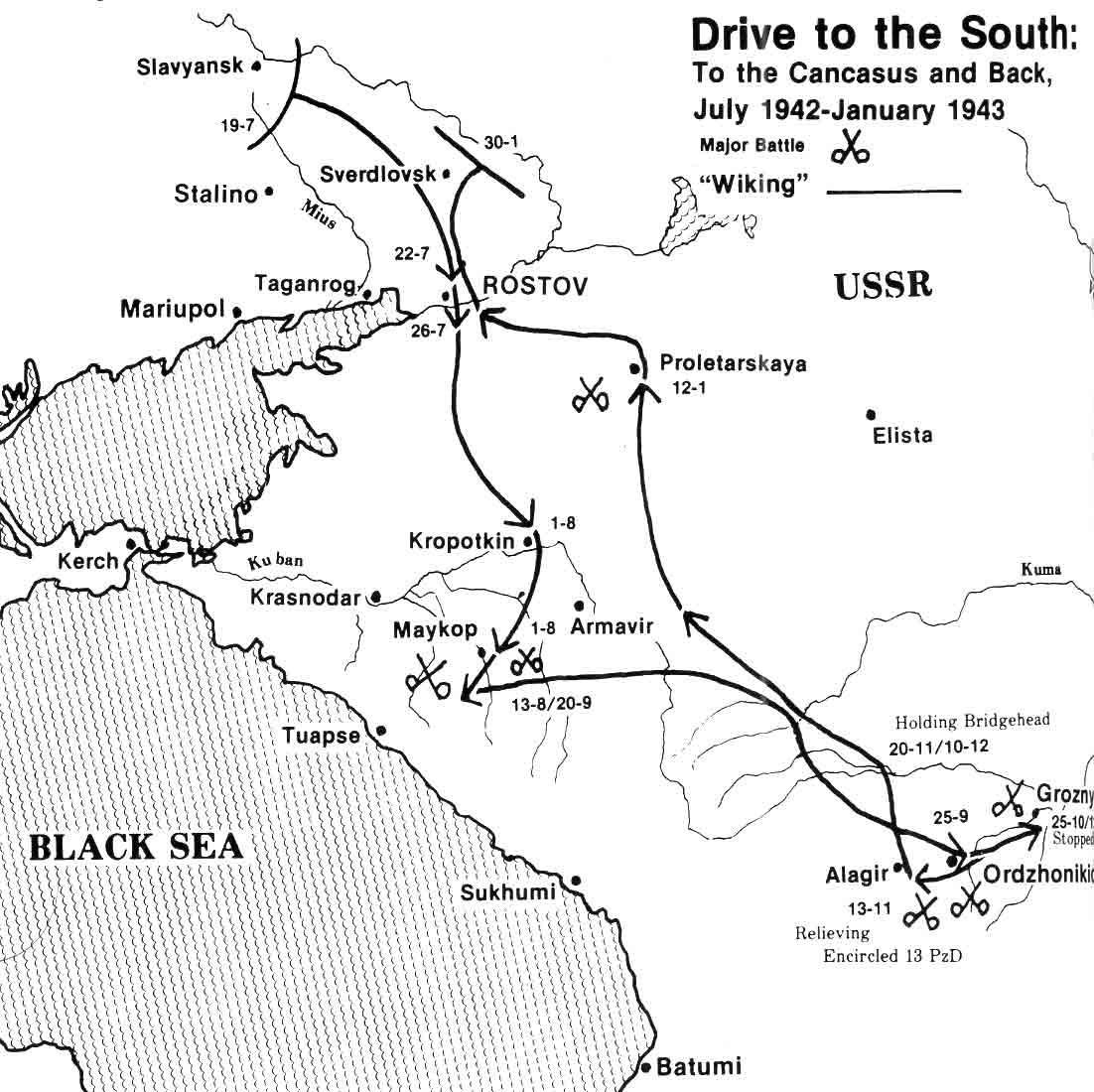 Единственная среди «первоначальных» дивизий СС, «Викинг» не была отведена во Францию для переоборудования, а была усилена, пока находилась на позиции на Миусе. Там она получила такое же усиление, включая танковый полк. И она была первым, кто испытал свою новую бронетехнику, поскольку его направили в состав 57-го танкового корпуса вместе с 13-й танковой дивизией и взяли на себя ведущую роль в предстоящем летнем наступлении. Наступление началось 19 июля 1942 года, и Викинг с самого начала наблюдал тяжелые бои, сначала при наступлении на Ростов, а затем на нефтяные месторождения Кавказа. К сентябрю часть нефтяных месторождений оказалась в руках немцев, но атаки прекратились, сдерживаемые самими расстояниями, которые они преодолели. В то же время, когда в ноябре 1942 года дивизия была переименована в танково-гренадерскую дивизию СС «Викинг», наступление было формально прекращено и заняли оборонительные позиции вдоль Терека. Атаки русских под Сталинградом наконец заставили немцев признать слабость своих позиций на Кавказе и ознаменовали отступление группы армий «А» с юга. К январю 1943 года, когда прибыли другие соединения СС, чтобы помочь остановить кризис на Донце, Викинг вернулся в Маныч, открывая путь отступления через Ростов. В то время как Манштейнское наступление ликвидировало проникновение русских к югу от Харькова, Викинг в середине февраля аналогичным образом был задействован для сдерживания атаки Первой гвардейской армии к югу от Изюма. Когда в конце февраля 1943 года было подавлено последнее сопротивление русских, дивизия находилась почти в том же положении, что и год назад, позади «Миуса» и нуждалась в переоснащении.