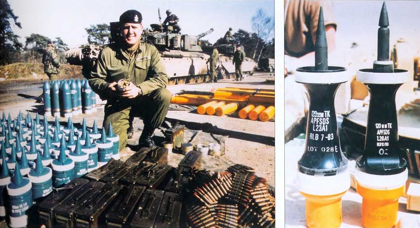 Даже «разбомбить» танк на полигонах, а не в условиях боя — все равно трудоемкая работа. Здесь члены экипажа загружают тренировочные боеприпасы (обратите внимание, цвет отличается от боевых снарядов). На фотографии: слева — тренировочные снаряды APDS (Armour-Piercing Discarding Sabot) и HESH (High-Explosive Squash-Head), а также заряды сумки, и ленты с пулеметными боеприпасами для спаренного пулемета. Справа — современные танковые боеприпасы включают бронебойные снаряды со стабилизированным оперением для сброса подкалиберных снарядов, например, для британской 120-мм/4,72-дюймовой танковой пушки. Снаряд, наносящий урон, — это Long Rod Penetrator (здесь представлены две версии), позволяющий преодолевать броню из обедненного урана.