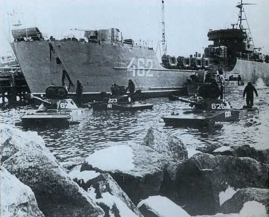Легкие танки-амфибии по-прежнему чрезвычайно полезны в разведывательных целях. Здесь несколько советских ПТ-76 выплывают на берег во время учений.