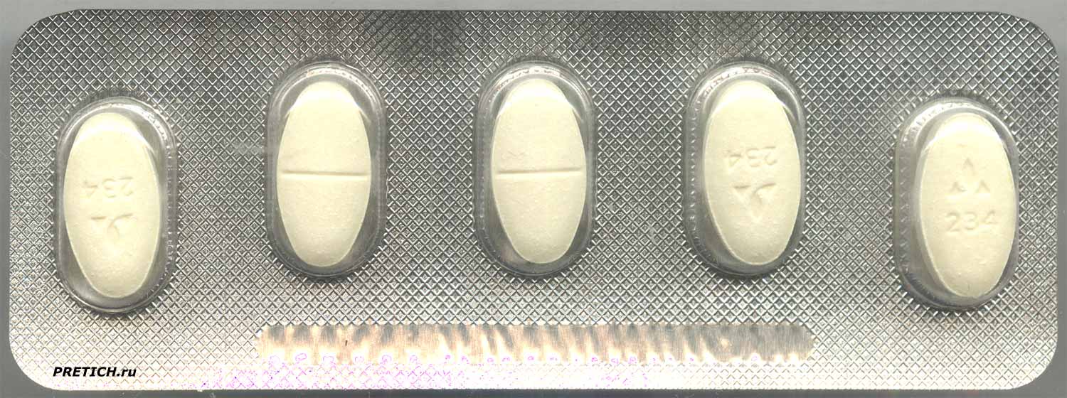 Затем достаем из упаковки четыре вот такие блистерные упаковки, в каждой пять таблеток. Они имеют овальную форму и это очень удобно для приема внутрь! С одной стороне на таблетке нанесен логотип производителя и цифра 234 (она означает дозировку 500 мг, прочие имеют иные цифры: 231 - 125 мг, 232 - 250 мг, 236 - 1000 мг). С обратной стороны таблетки есть риска, чтобы делить таблетку пополам.