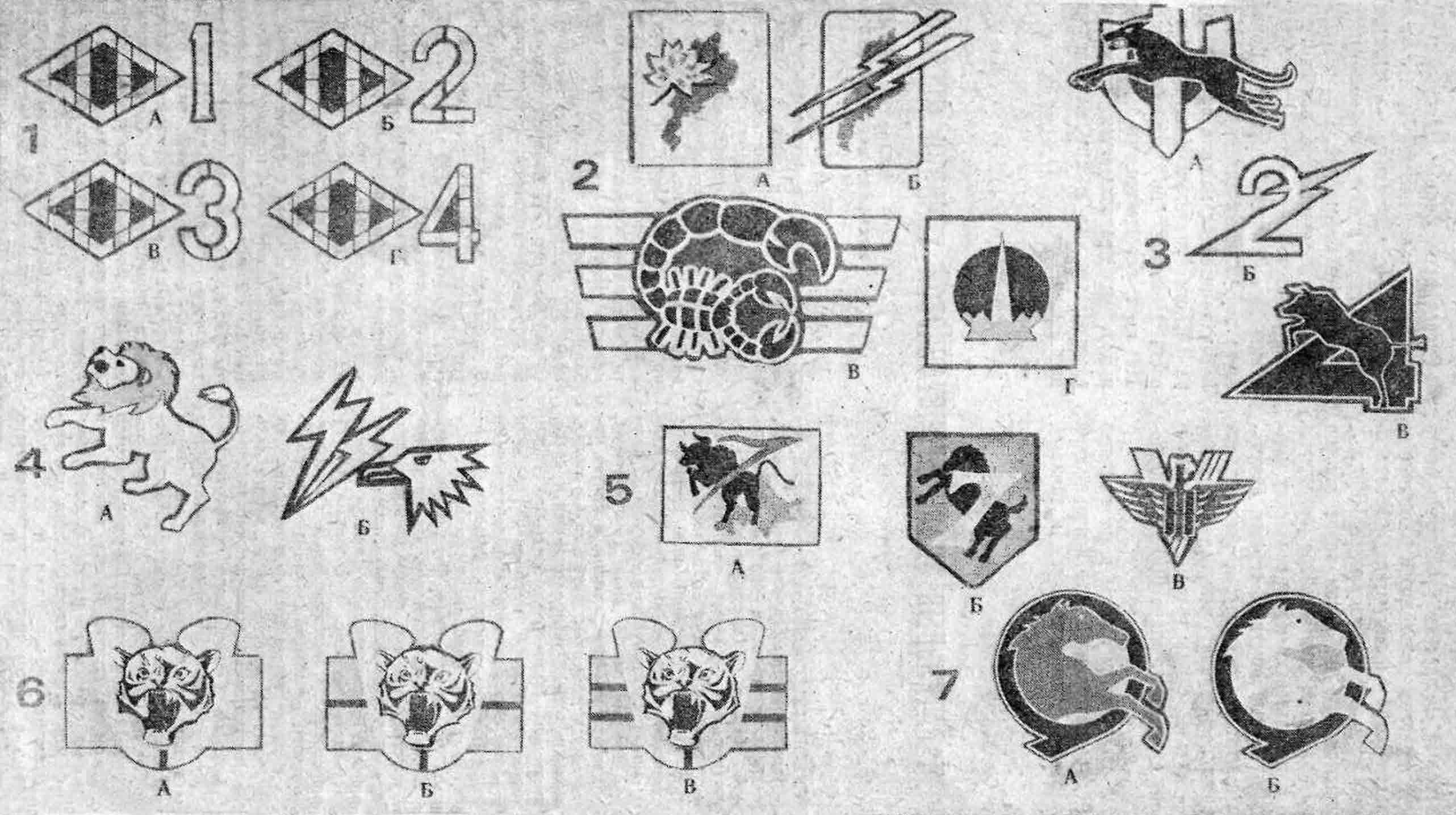 Как уже отмечалось выше, свои опознавательные знаки имеют отдельные части и подразделения, в том числе и учебные, на вооружении которых находится бронетанковая техника. В зарубежной прессе сообщалось, что для определения принадлежности танков или бронетранспортеров к тому или иному такому подразделению используются самые разнообразные эмблемы. Характер рисунков, надписей и условных обозначений можно проиллюстрировать на примере учебного танкового подразделения. Его 1-я рота — белый гриф с поднятыми крыльями и головой, соответствующей окраске танка (иногда голову птицы красят в черный цвет, 12а, б). Кроме того, в роте есть также несколько видов индивидуальных эмблем, наносимых на боевые машины (12в, г, д, е). На танках 2-й роты изображена падающая комета (звезда белого и хвост желтого цвета) с красной цифрой, обозначающей номер танка в роте (12ж), 3-й роты — желтый журавль с опущенными вниз крыльями на фоне белых полос, количество которых определяет принадлежность танка к конкретному взводу (12з, и, к). Для 4-й роты характерен рисунок в виде белого крылатого коня (12л) и для 5-й — стоящего на задних лапах белого льва (12м).