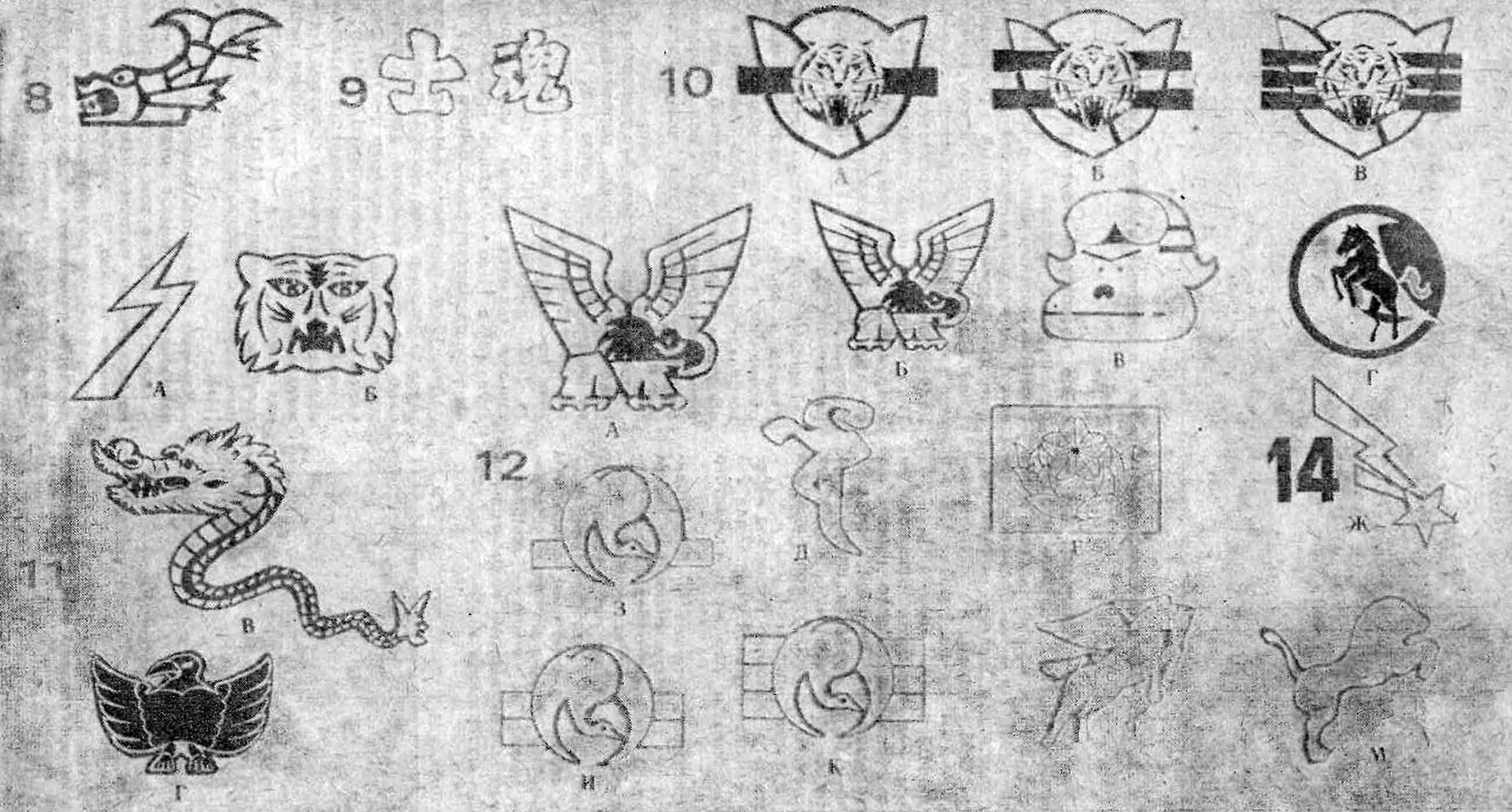 Опознавательный знак 9-го танкового батальона — синяя лошадь, выпрыгивающая из цифры 9 красного цвета (7а). На танках командиров рот нанесен такой же знак, но изображение лошади белого цвета (7б). Эмблемой 10-го танкового батальона является желтая стилизованная акула (8), а 11-го — надпись «рыцарство», нанесенная иероглифами белого цвета (9).