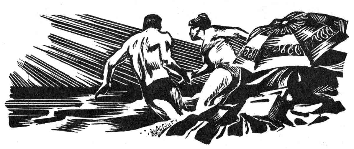 Наше излюбленное место свободно, а рядом вижу полотенце, беленькие босоножки, очки — все под зонтиком. Я как-то и значения соседству не придал. Женщина рядом. Ну и пусть! Пошел искупаться. Возвращаюсь, посматриваю на верх лестницы, не идут ли мои. Подхожу к своему месту, вижу — рядом с зонтиком девушка сидит. Стройная блондиночка, только вся багряная— обгорела, недавно, видать, приехала, не убереглась от знойного солнца. Я на нее не смотрю в открытую, а так, незаметненько, из-под темных очков. Моя соседка на меня не смотрит. Тоже мне цаца. Вижу, стала она кремом руки, ноги, плечи натирать. Не спеша, осторожно. Больно, наверно, кожу-то здорово спалила. Вдруг слышу: «Молодой человек, товарищ, помогите мне, пожалюйста». Оглядываюсь — девушка протягивает мне флакон с кремом. «Отчего ж не помочь», — согласился я. Взял на ладонь крему и осторожненько стал его растирать по спинке. Понимаю, крепко нельзя, больно будет. Она и так гнется, хохочет и лепечет: «Ой, не так сильна! Все, спасипа! Спасипа!» — по говору догадываюсь,девица из Прибалтики. Я ей говорю: надо хорошо растереть, раз просила, сделаю по-флотски. «Я так и думала, что вы моряк», — сказала девушка. Я не успел спросить, как она догадалась. Почувствовал, что кто-то сзади стоит. Большая тень и маленькая обозначились рядом с нами... А тут и сумка на камни упала, в ней жалобно звякнула бутылка с кефиром. Жена резкими движениями стала раздевать дочку и, видно, сделала ей больно, та заревела. Получив щелчок, заревела еще громче.