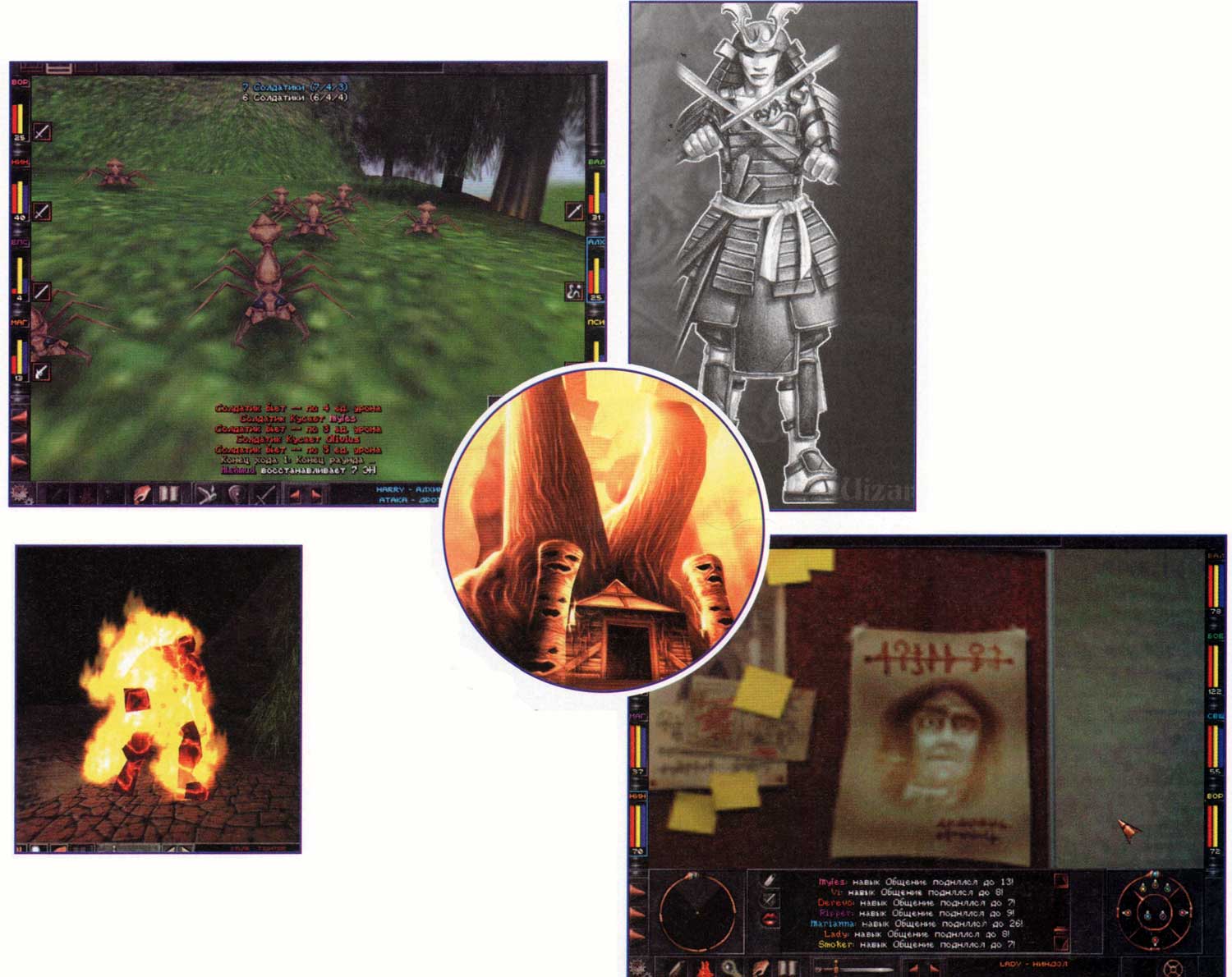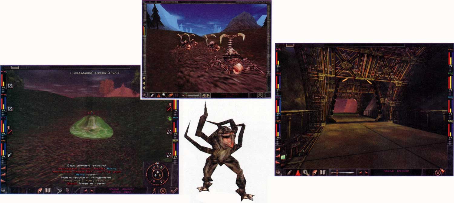 Ну и еще об одном прелюбопытном факте хотелось бы рассказать. У игры несколько начал. Как вам заявленьице? Мне тоже понравилось. Это же не просто следующая игра из серии Wizardry — это сюжетное продолжение Crusaders of the Dark Savant, а следовательно, если у кого остались сейвы от седьмой части, их можно смело грузить в восьмую и играть знакомыми с детства персонажами. Правда, я думаю, не у многих сохранились эти самые сейвы — все-таки со времени выхода «Крестоносцев» прошло почти десять лет, ведь они увидели свет в 1992 году. Лично я прошел их в 1994-м, и один из сейвов все еще валяется у меня на винчестере. Если кто помнит, в Wizardry VII было несколько финалов. В финале можно было наехать на Dark Savanta, пытаясь защитить подругу Виталию и героически помереть, а можно и отдать злыдню артефакт, который он долго и упорно требовал, чтобы затем двинуться за ним в погоню на корабле, управляемом все той же Ви. Говорят, что если закорешиться с ти-ренгами или ампани, с планеты можно улететь и на их кораблях, но первые были мне крайне несимпатичны, в связи с чем я их вынес, а вторые слишком увлекались муштрой и прочим железным порядком, так что я не стал заводить с ними тесных отношений. Так вот, после окончания игры любым из этих способов генерировался специальный файл, который, будучи загруженным в Wizardry 8, начинал сюжет своим способом. Как я уже говорил, у меня сохранился лишь один финал — тот, в котором я спасаю Виталию, поэтому мне точно не известно, как начинаются остальные сюжетные линии. Знаю только, что даже мертвую партию каким-то образом переправляют в трюме корабля.