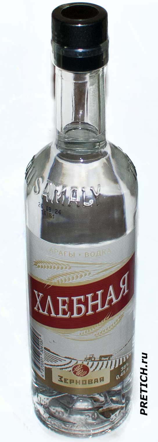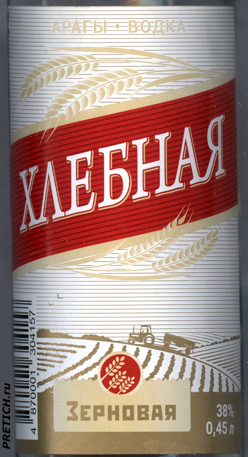 Этикетка, она также достаточно скромная. На ней изображены пшеничные колосья, надпись Хлебная. Затем поля и холмы, трактор... и ниже - Зерновая. 38% и 0,45 л. Этикетка по скромности соответствует образцам советской эпохи - мне лично такое больше нравится.