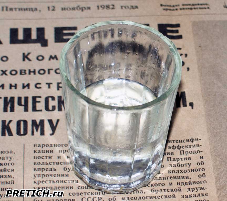 Наливаем содержимое в стопку - граненый стакан еще с середины 1970-х годов... На вид - прозрачная жидкость.