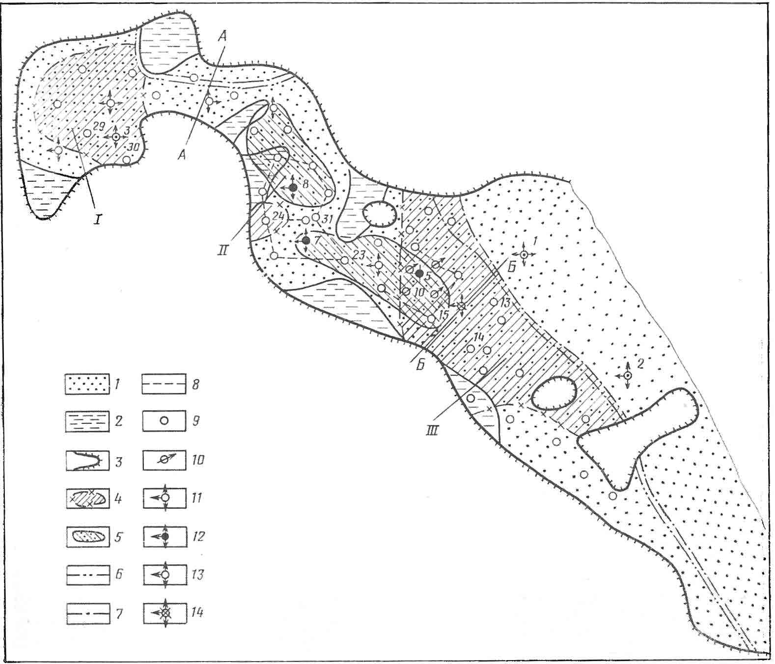 Рис. 1. Схема залежи № 24: А, Б — границы участков; I. II. III — участки разработки различными методами; 1 — песчаники; 2 — алевролиты; 3 — зоны выклинивания; 4 — заводненные участки к 1 / I 1984 г.; 5 — зоны охвата газами горения; 6,7 — соответственно внутренний и внешний ВНК; 8 — границы элементов скважин; скважины: 9 — добывающие, 10 — контрольно-добывающие, 11 — водонагнетательные, 12 13 — зажигательные (действующие, проектные), 14 — ликвидированные.