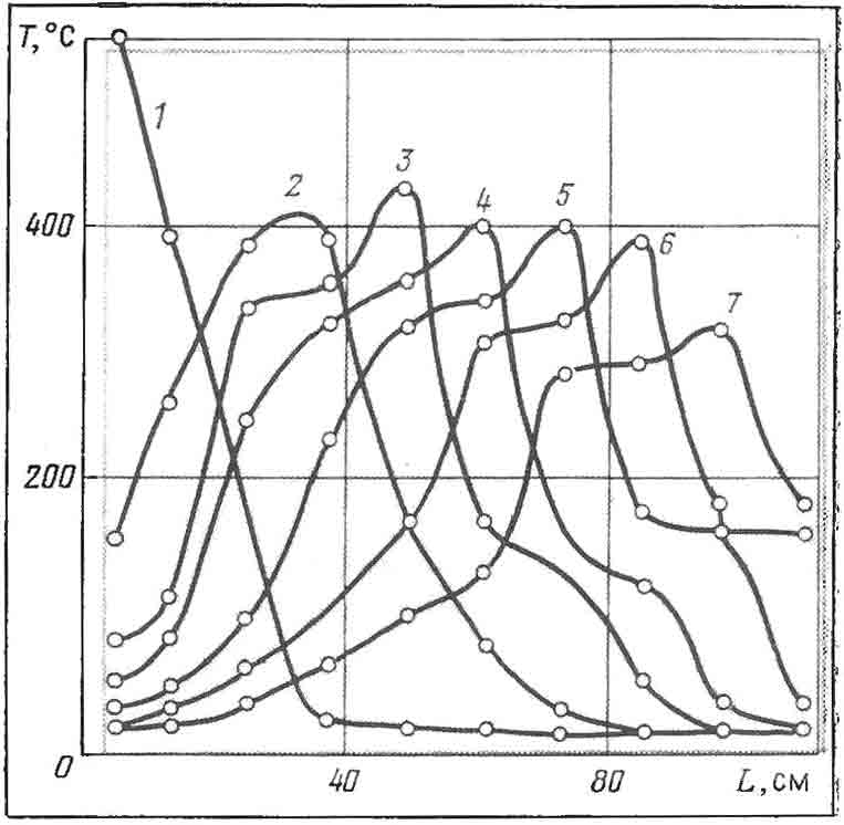 Рис. 2. Профили распределения температуры Т по длине модели пласта L в различные моменты времени замеров (1-7)