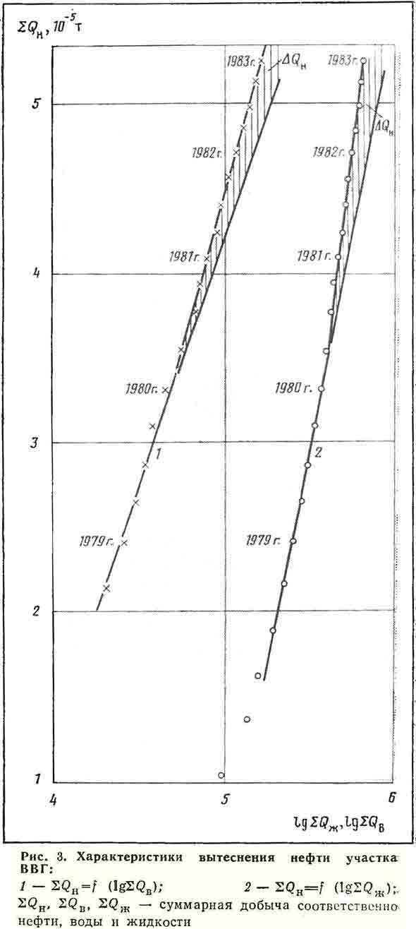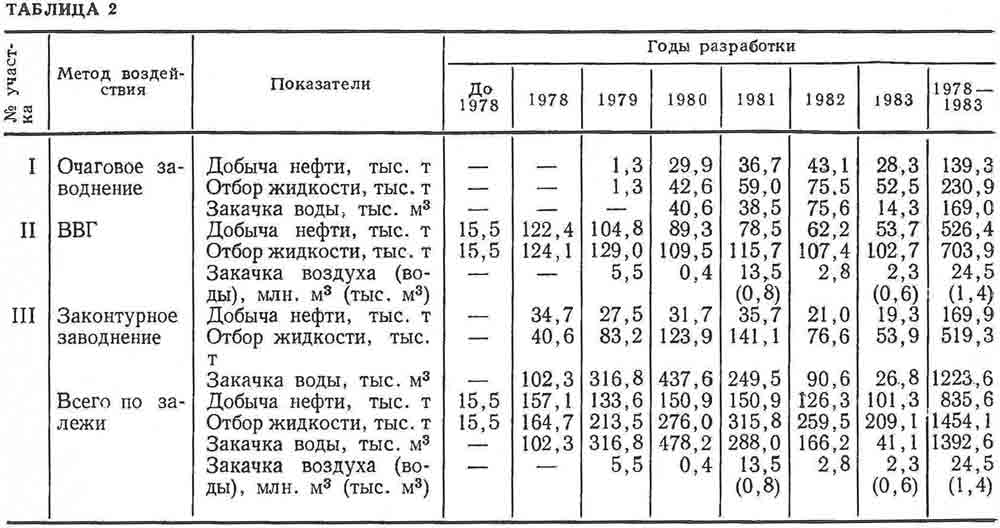 Показатели разработки залежи в целом и ее отдельных участков, показанных на рис. 1, приведены в табл. 2. Из нее видно, что на участке ВВГ нефть добывали с меньшим извлечением воды из пласта по сравнению с другими участками. Кроме того, достигнута наибольшая нефтеотдача, что объясняется особенностями его геологического строения и гидродинамическими условиями разработки. Вследствие разных сроков ввода в разработку отдельных участков, а также дисбаланса закачки и отбора между участками происходили перетоки нефти и воды (особенно до 1981 г.). Снижение объема закачки воды в законтурную область и 1981-1983 гг. и нагнетание воздуха приостановило ее продвижение по пласту, в результате обводнялась только скв. 10.